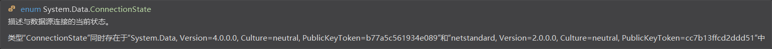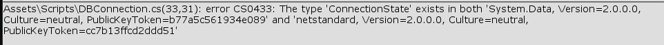 原本按照找到的方法将D:\Program Files\Unity\Editor\Data\Mono\lib\mono\2.0中的I18N.dll、I18N.CJK.dll、I18N.West.dll和System.Data.dll放到了assets文件夹中,但是System.Data.dll和另两个地方的同名文件出现了引用重复,把那两个地方的文件去掉后,成功在vs 2017中引入了System.Data命名空间,但是在使用System.Data.ConnectionState的时候,又出现了如下的错误。
