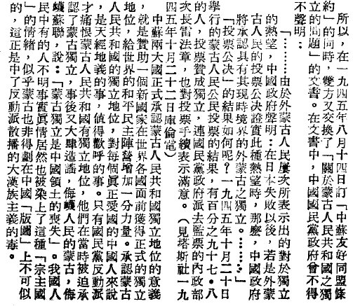 《人民日报》1950年2月14日:“只有国民党反动派才痛恨蒙古人民共和国有独立地位,他们在当时被迫承认了蒙古独立”