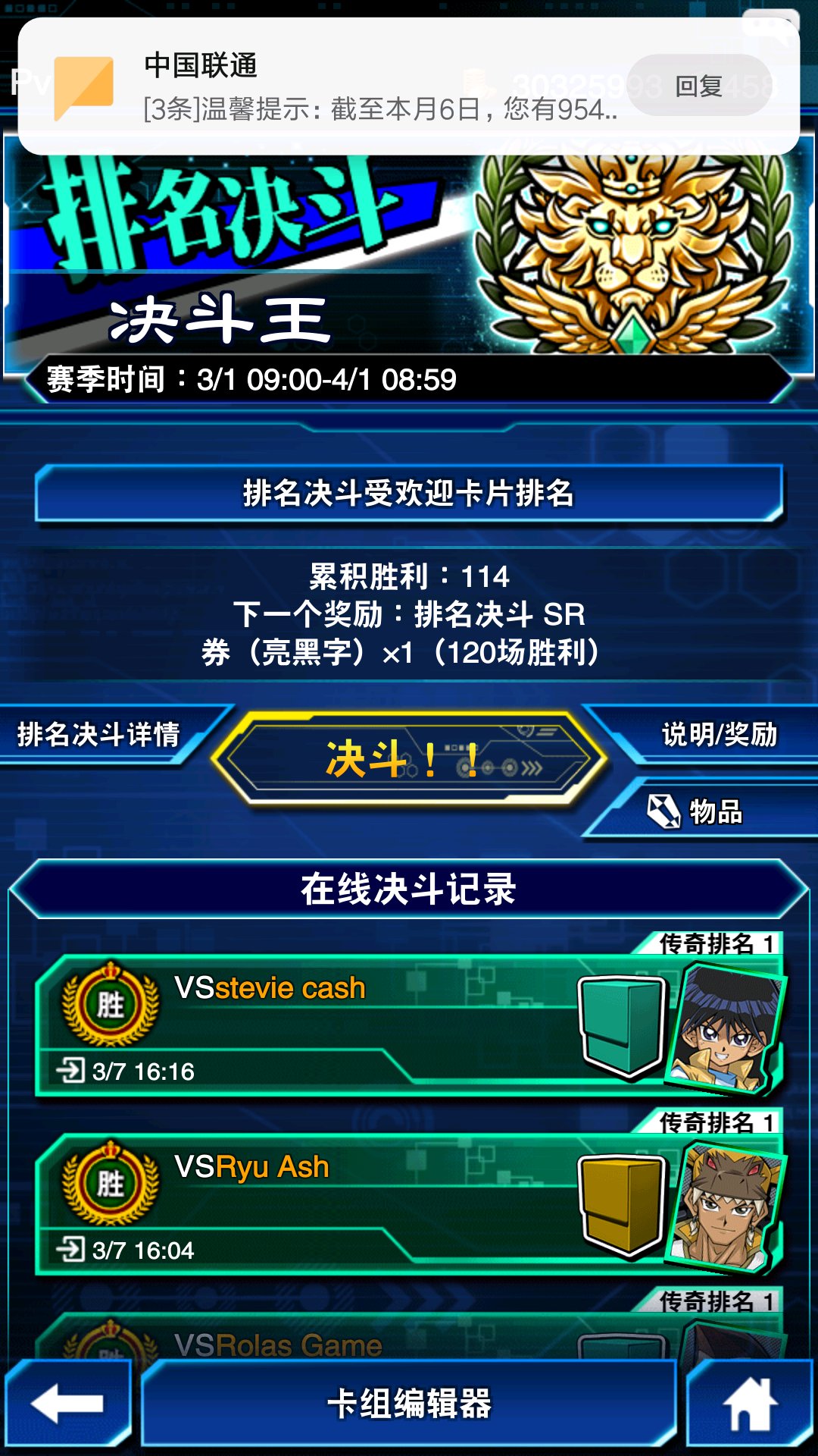 我用恐龙一直打到上王局最后一把,可惜运气有点差,遇到对面先手青蛙特招出人造人,没机会堆墓,飞龙炎也没来,之后一直输到传奇二换了古巨基中间输3把上了王