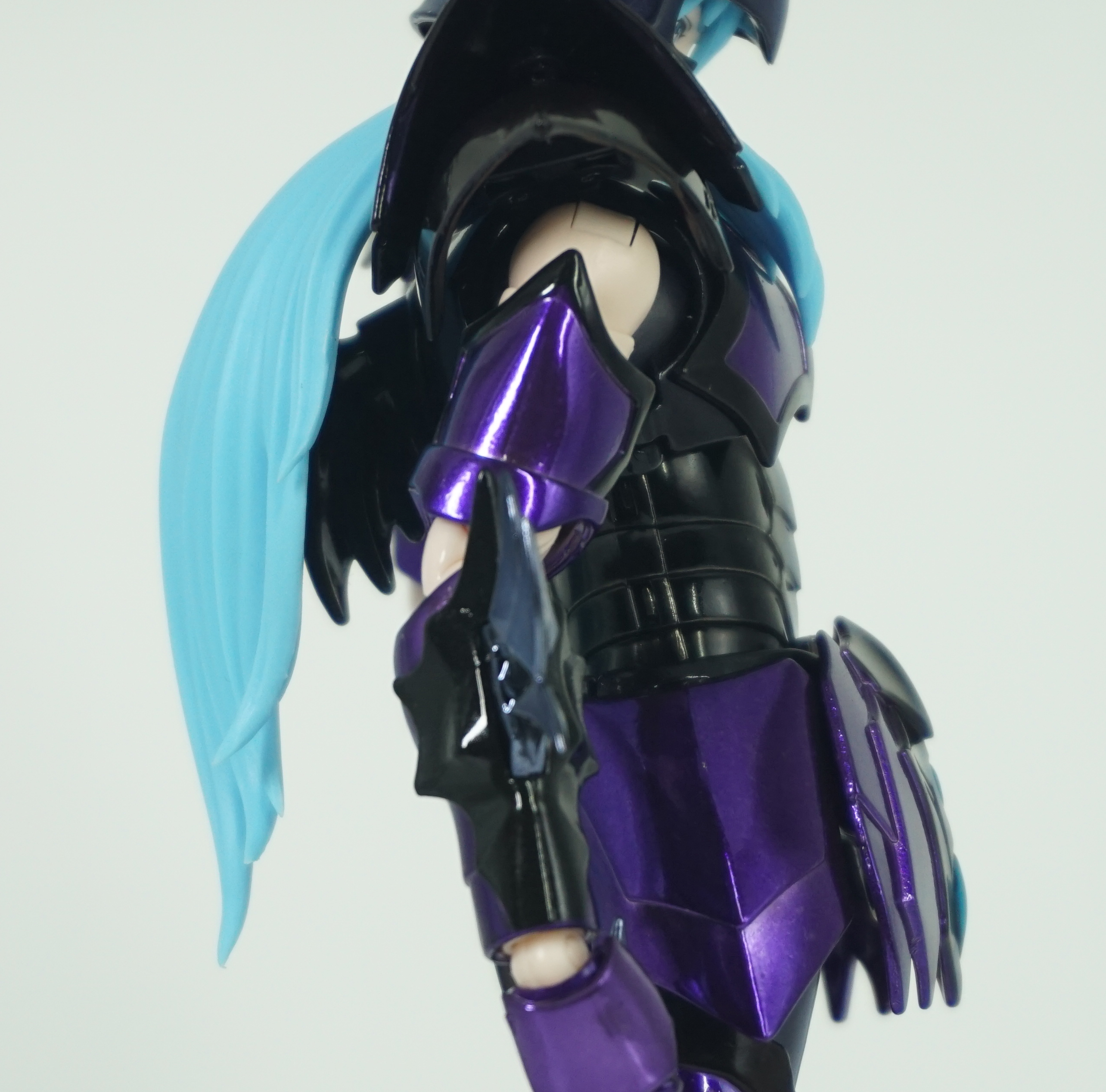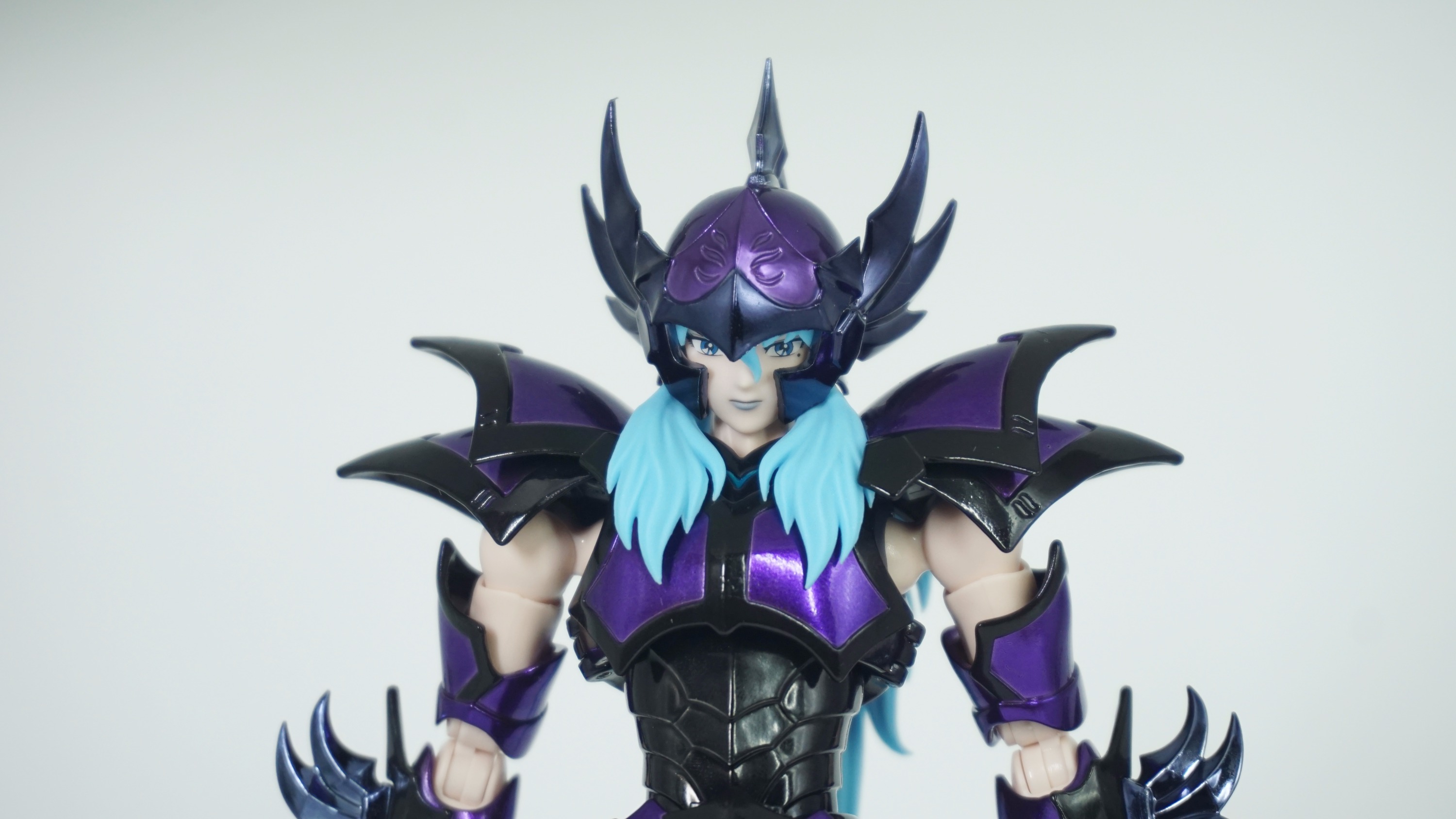 冥衣上身之后的双鱼座,浑身都散发着妖艳的气息,黑色和紫色相间的圣衣分色加上宝蓝色的零星点缀,简直不要太撩人。重新制作的面雕配合万代终于脑子开窍给配备的可动前发,极大的提升了头部的可动性,果然只有免冠造型才能充分展现冥双鱼的魅惑气质啊。冥衣各处零件的高度锐化处理也一改之前黄金圣衣的圆润,看上去就有点咄咄逼人的邪恶气息。背甲的鱼鳍其实是万代对三素时期冥双鱼的一个延续,但对比动画设定可以发现,其实这属于万代的自我发挥,所以严格意义上来说这里其实是有点魔改成分。但是,裙甲花纹边缘的上色不均、塑料鱼鳍导致的色差以及拼装过程中惨不忍睹的掉漆还是让这款冥衣在把玩的时候心惊胆战啊。