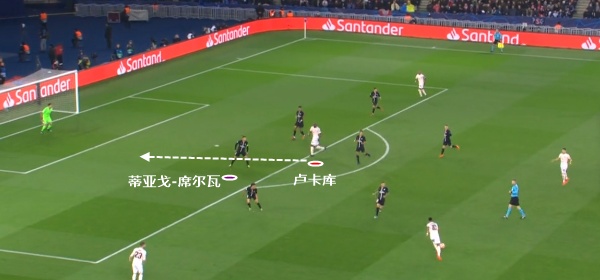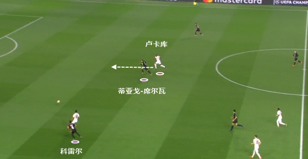 从图中可以看到,巴黎的第一个丢球,科雷尔莫名其妙地传球失误是主要原因。但是蒂亚戈-席尔瓦在中路过于迟钝的反应,缺乏回撤接应和保护的意识,让卢卡库轻松拿球,同样让人失望。
