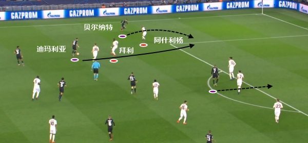 从图中可以看到,在拜利前顶的情况下,阿什利杨在落位换防之后,对于肋部空间保护不力。迪玛利亚在肋部的持球,结合贝尔纳特的套上,形成了很大的威胁,为中路姆巴佩跟进抢点,制造机会。