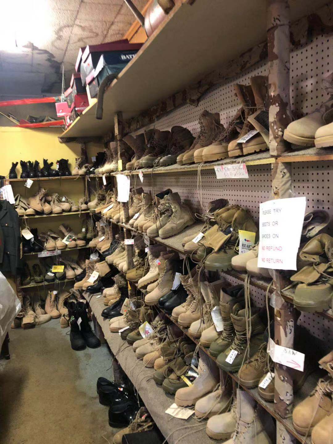 在美国,军品店大致分为两种,一种以U.S. Patriot Tactical (美国爱国战术)领衔的军警战术装备的商店,还有一种类似Army Surplus Store(陆军剩余商店)的二手商铺。前者一般卖的是各种供应商的品牌商品,而后者就是典型的二手商店。