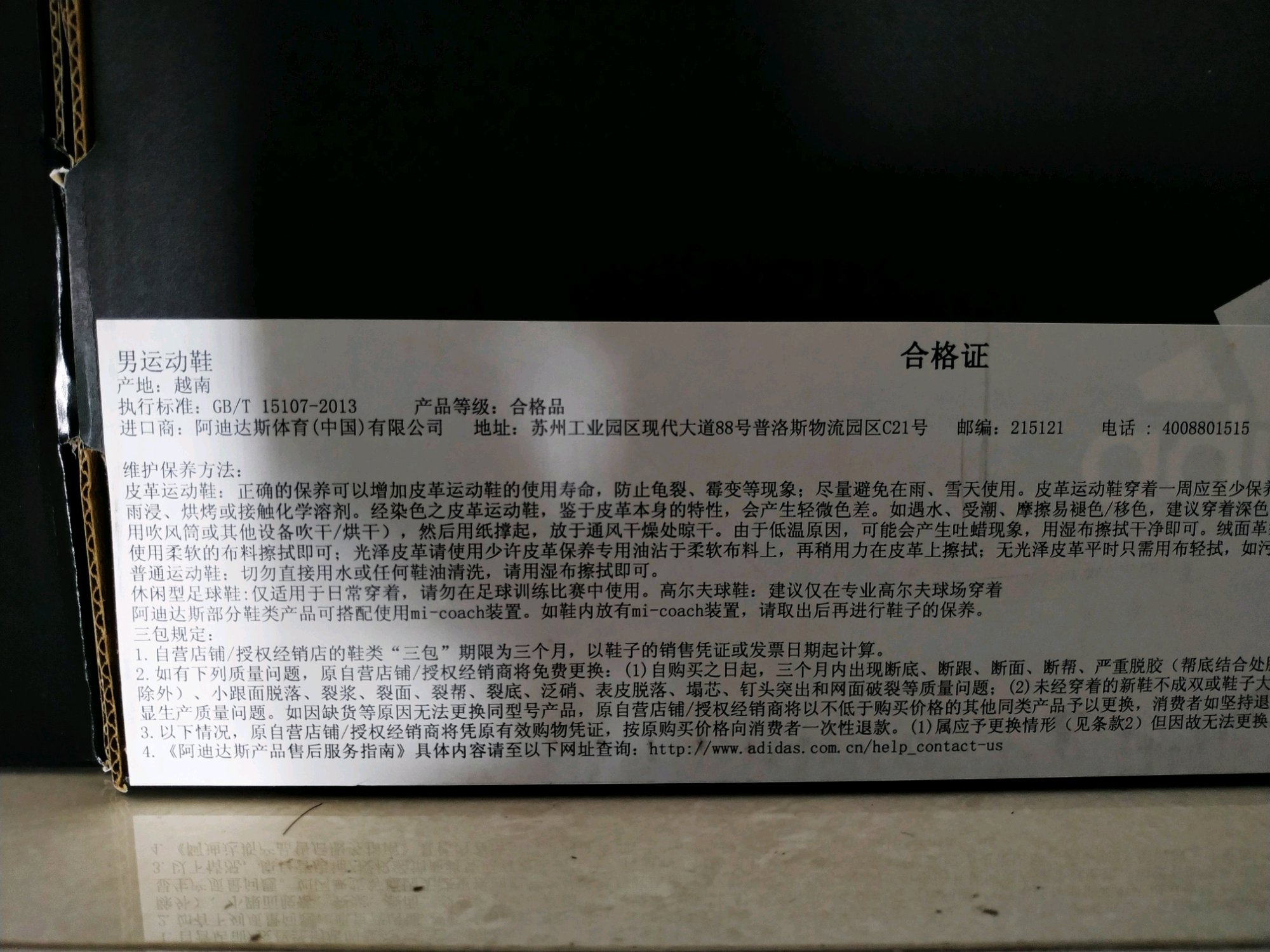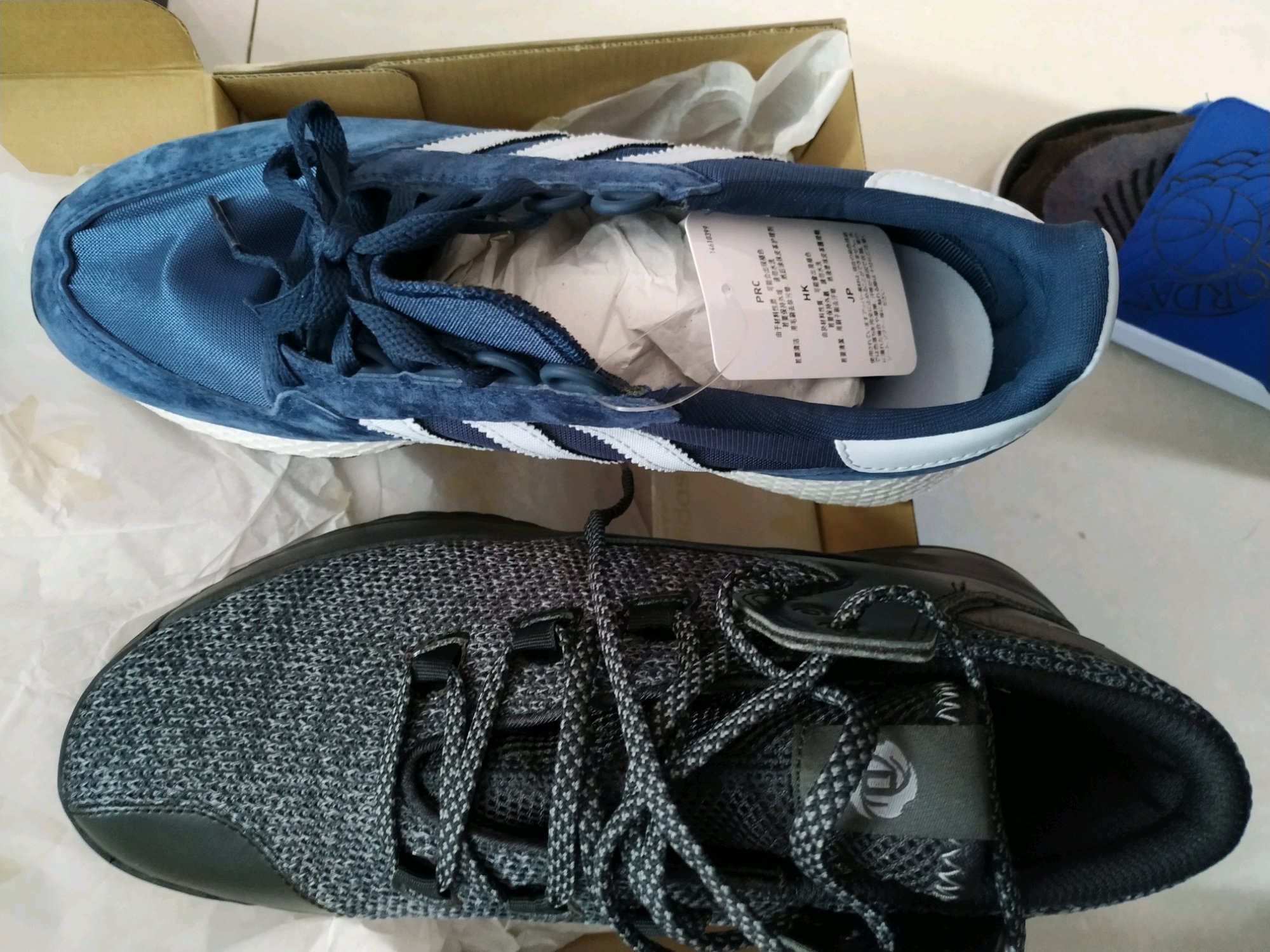 在某宝旗舰店入手的四双阿迪,四个产地,分两批物流发的,第一张蓝色盒子单独发的快递,其它三双鞋子一起发的,前三张图片产地一个湖南衡阳,一个福建福州,感觉满满的山寨。其次是第四张和鞋子图片,印尼产地,一般般,第六和第七张最好了,感觉正版杠杠的,产地越南。这四双鞋子一共八百多