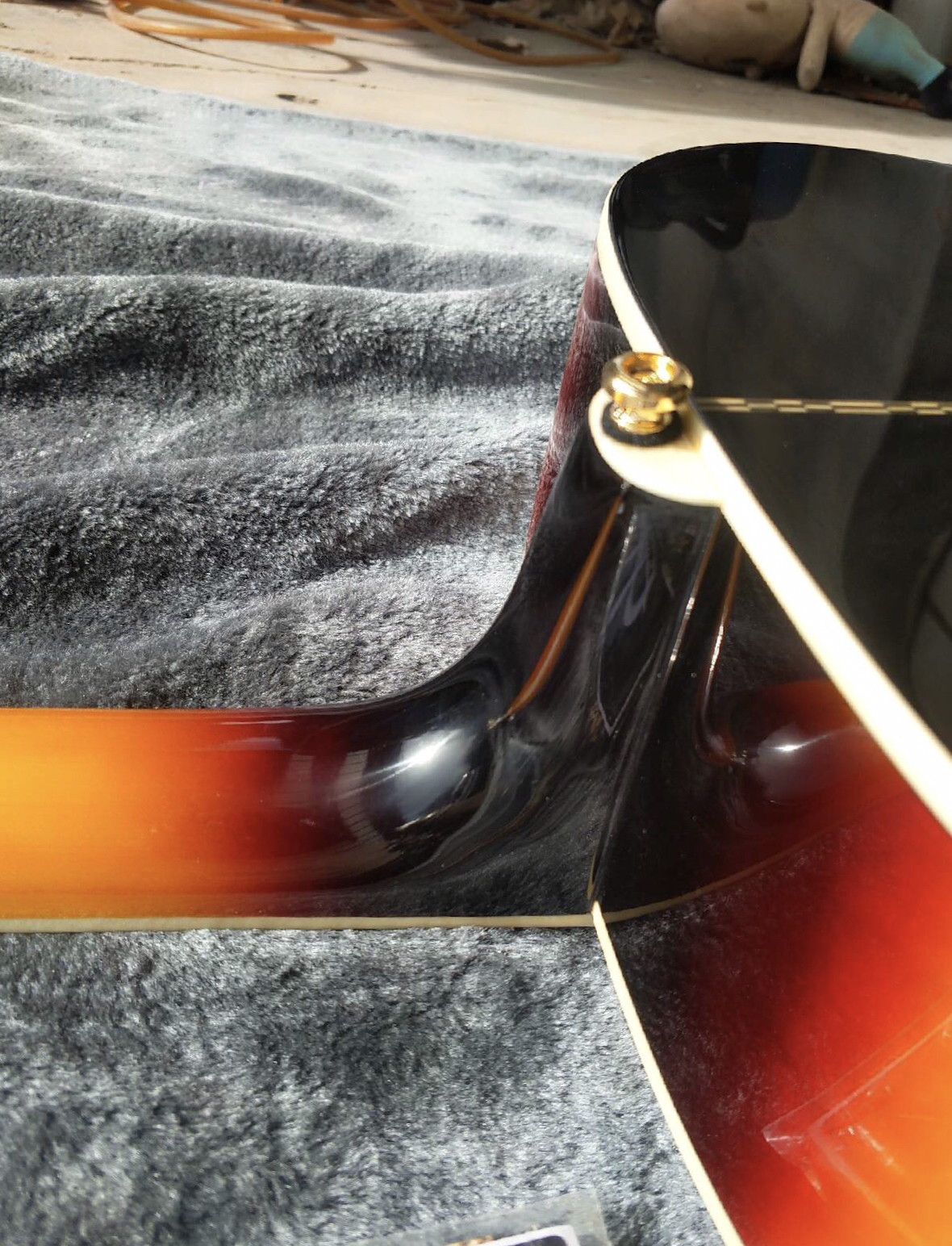 感觉假,logo大小有点不对,中间标志有点歪,最假的是背后的背带钉,原厂只会给你安装吉他背带的尾钉,不会给你在琴颈钉的