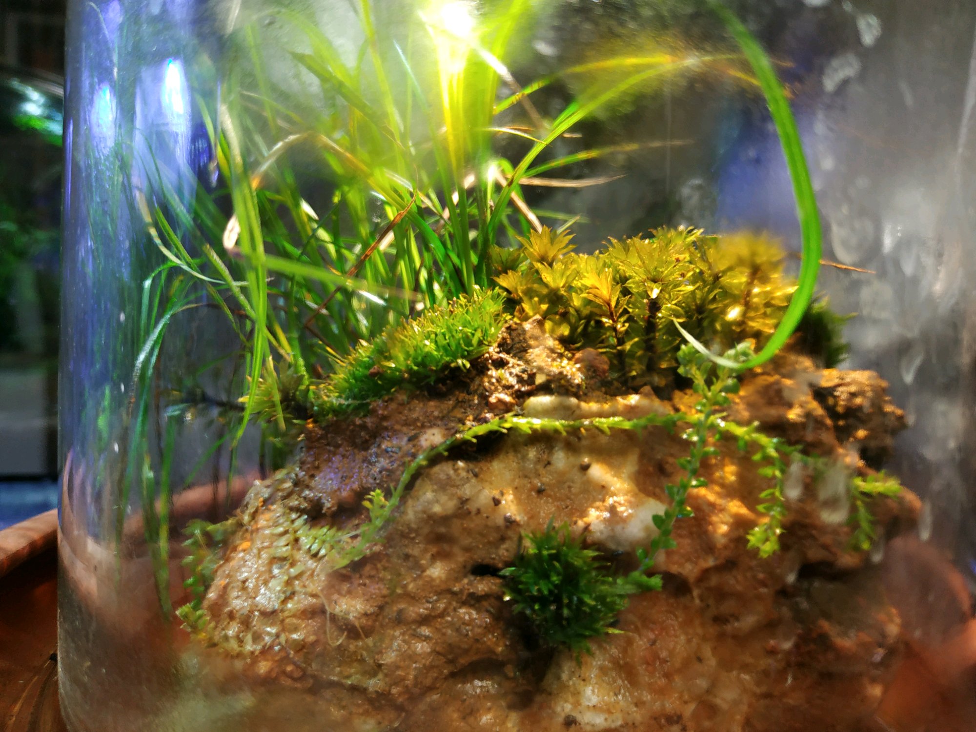 下面是紫砂盘,上面罩的是宜家买的玻璃杯。不透气但是透光。就这样养着看看能够活成什么样子吧!