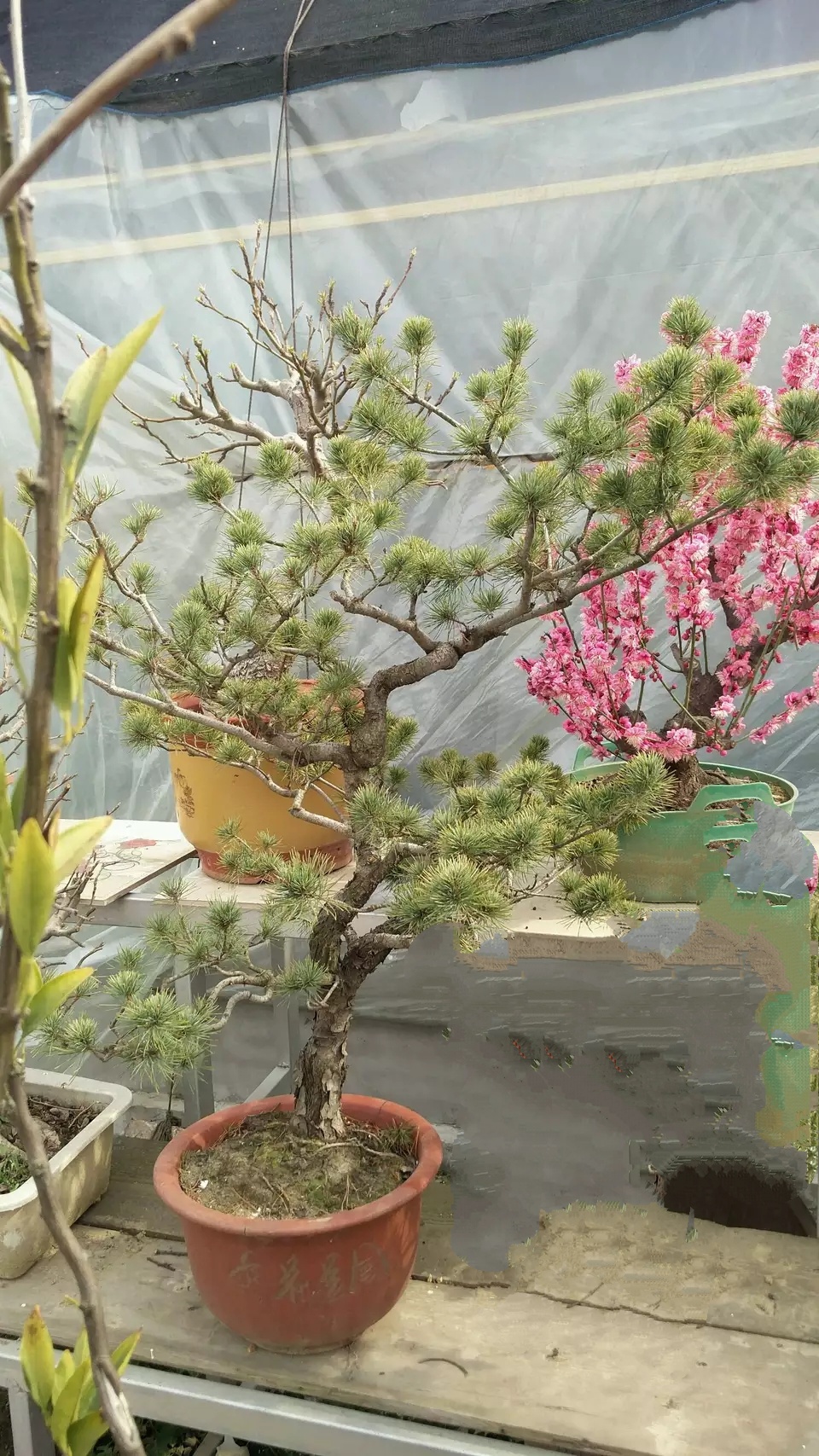 市场淘了棵五针松素材,高度近一米,就看中树干爆皮苍老,回来拿