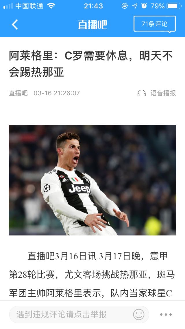 阿莱格里:C罗明天轮休