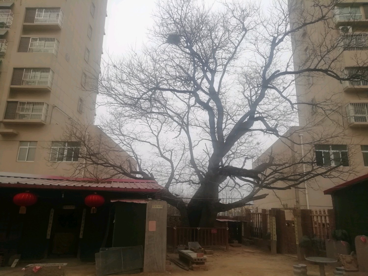 这棵古槐位于牛庄社区院内,我进到小区内很容易就来到了大槐树前。槐树下东西各有一座庙堂,西边的为玄帝庙,东边的为观音堂。古槐位于两庙堂中间,下边已经用木栅栏围了起来,栅栏上挂有市绿化委员会的铭牌,标明的树龄为220年。当我看到它的树干时,不禁呆住了:树干大概有四人合围粗细,这已经令人吃惊了,更使人惊异的是树干竟然为中空的!这还不算,而且树干朝南的方向有一个大裂口,给人的感觉就好像树干是从这里被整个挖出来一样!再往上的树干就像剥开的香蕉皮一样向外分出了三股主枝,向西、向东伸展的两枝稍低,向南长的这枝则直往上延伸。三股主枝然后又分出许多分枝,由于是冬季,各枝条看得清清楚楚,而且在最高处还有一个鸟窝。我仔细观看,发现向东、向西的两股主枝在离主干不远的地方还有折裂的痕迹,似乎随时都有断掉之欤。想想也是,三根重重的主枝,竟然仅仅由薄薄的一层树干来支撑,没有断裂已经是奇迹了,出现裂痕不是很正常吗?
