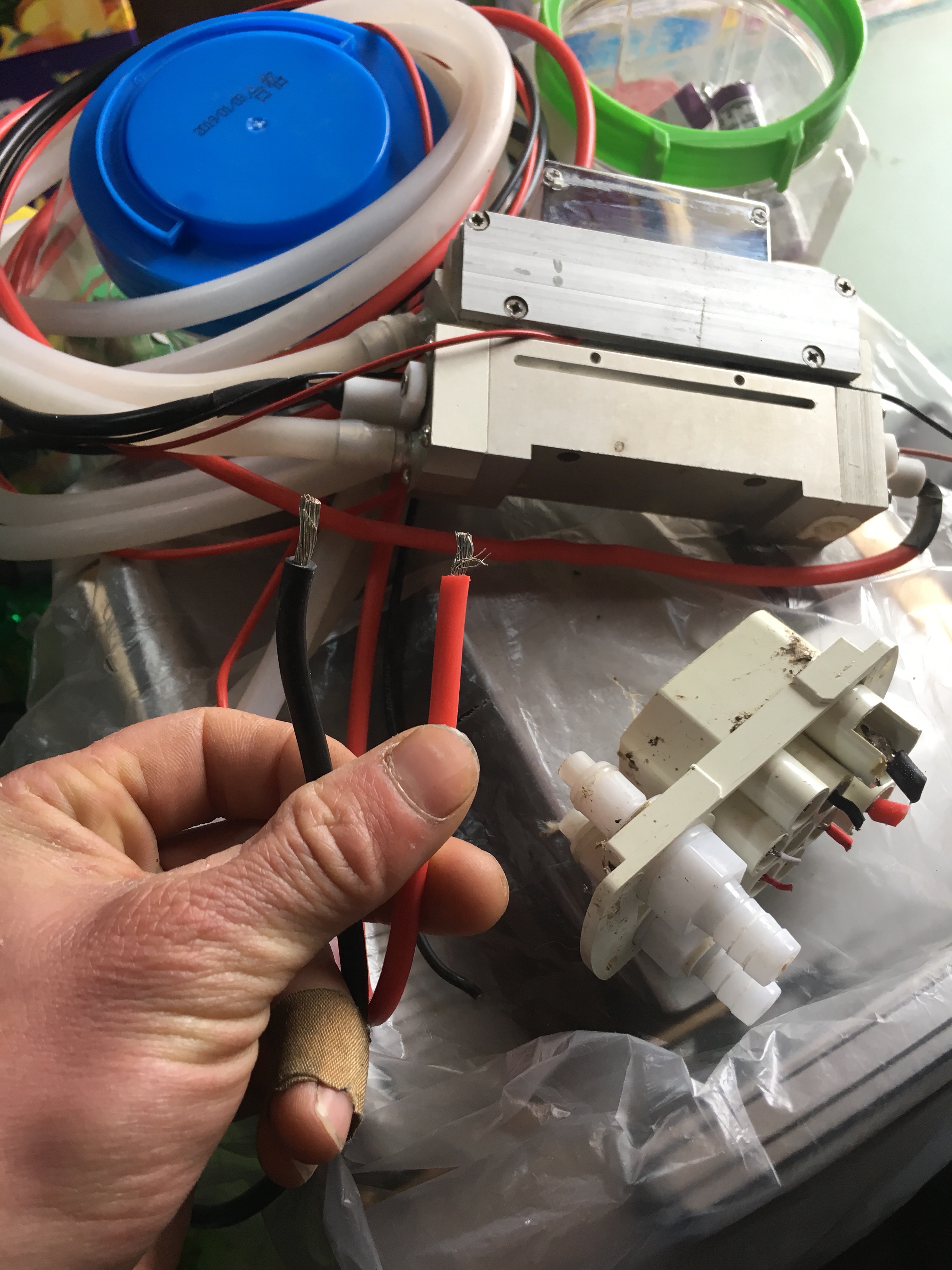 按理说最粗的红黑两根线是激光头供电,细的红黑是温度传感。另外两根细的是启动开关。