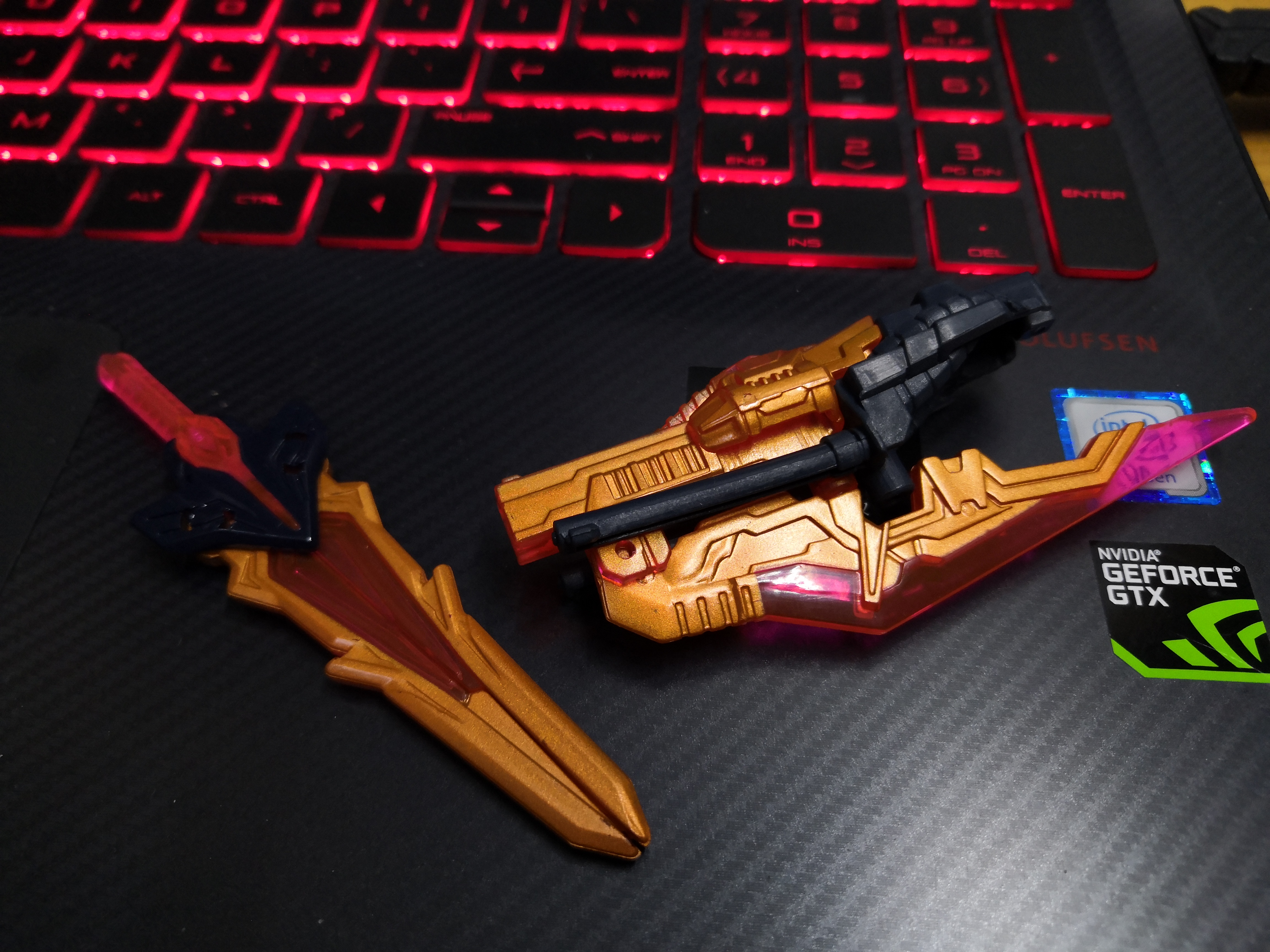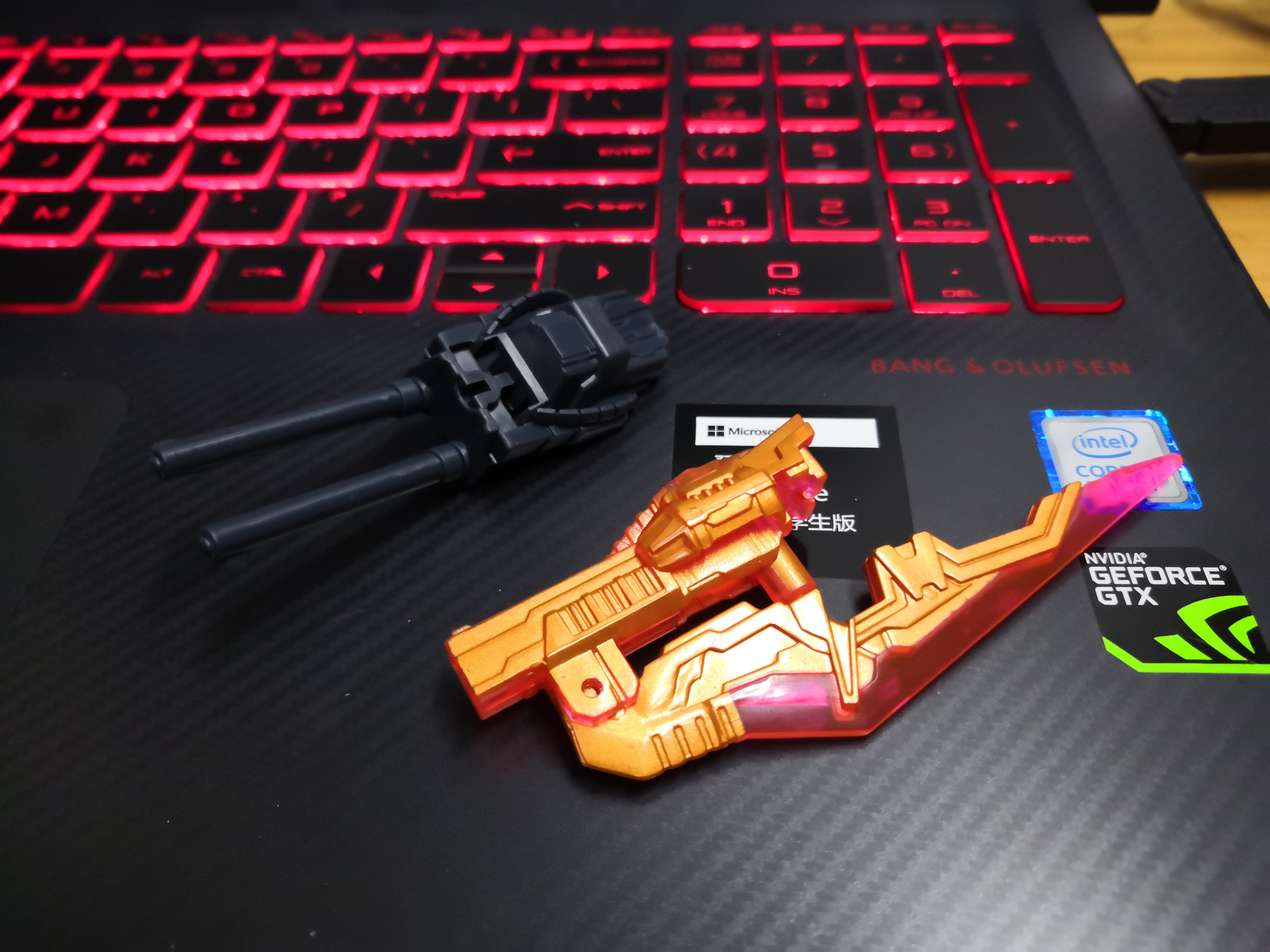 再来看看武器,一把剑一把枪剑,枪剑能分离,不过怎么看都有点GN剑Ⅲ的感觉[你懂的],左边的剑还能变成剪刀,可玩性不错,透光度也很好,涂装漂亮