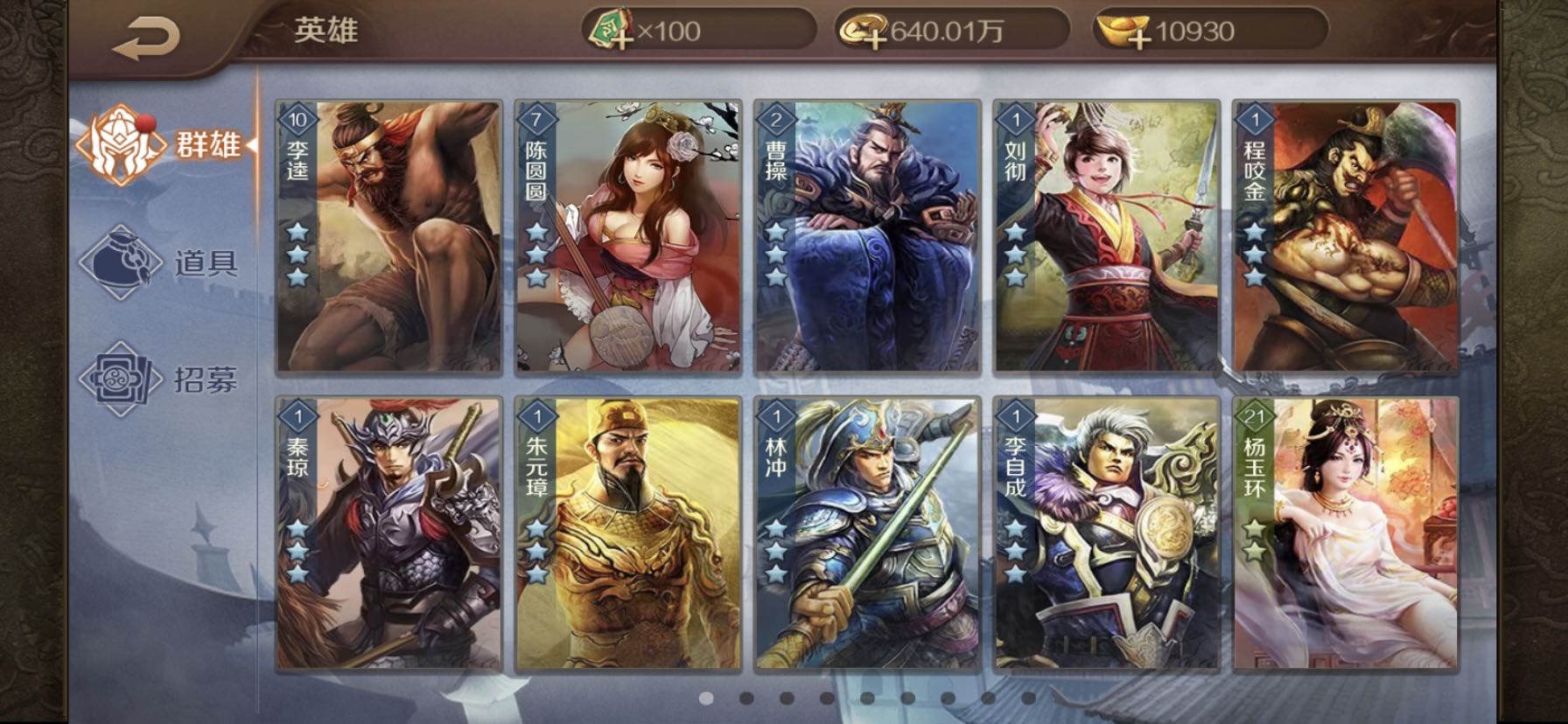 除了宋江,其余的都是石头开的,目前在刷宋江元神,等待升五。万能碎片也在攒,等活动兑换个五星印,忍到大龙珠。