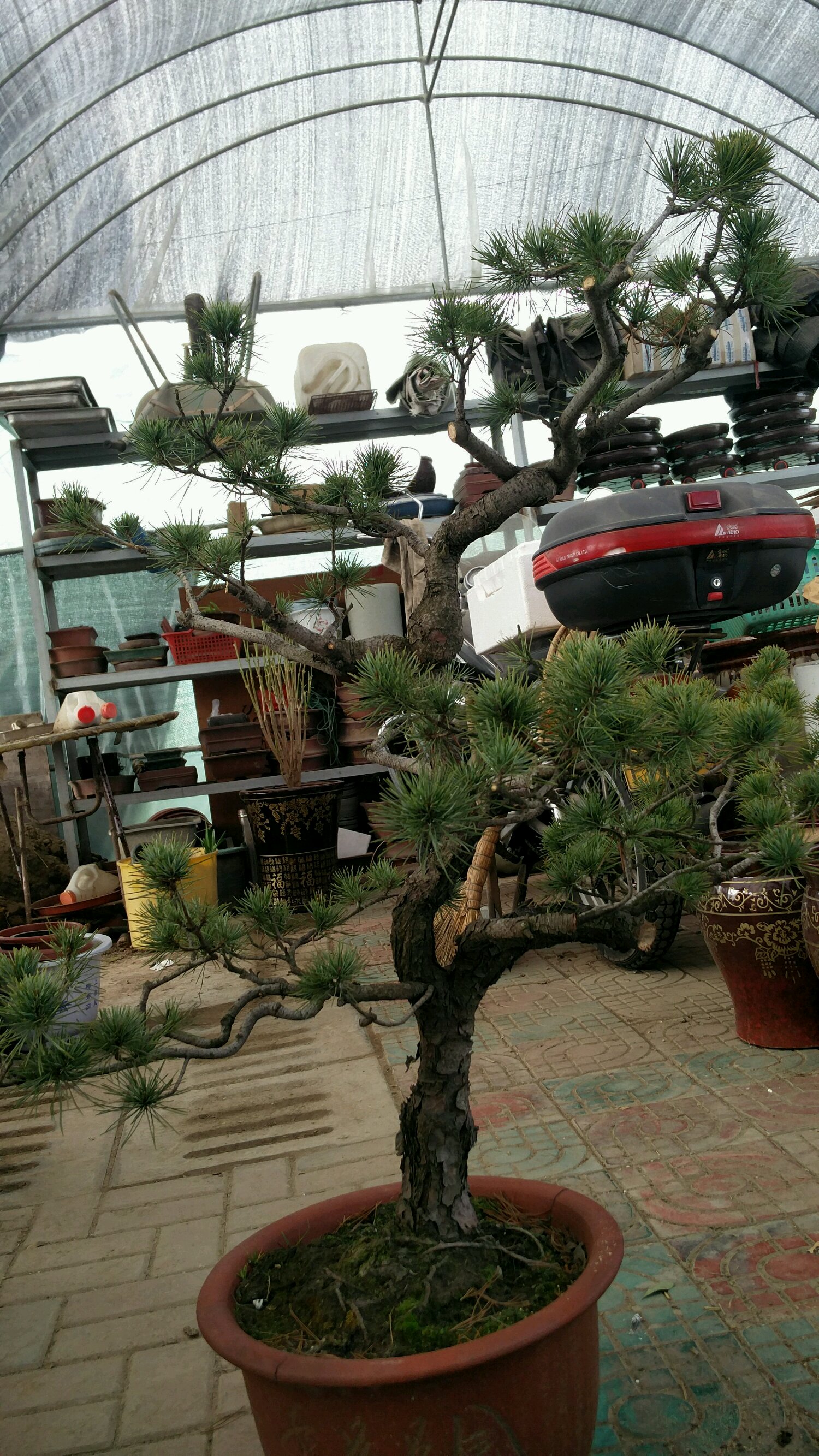 一棵五针松素材的杀枝过程。由于不会粗枝拿弯,只能硬杀。素材近