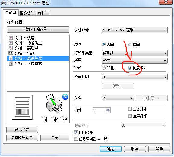 EPSON l310墨仓机,怎样设置才能不打彩色,只打黑色
