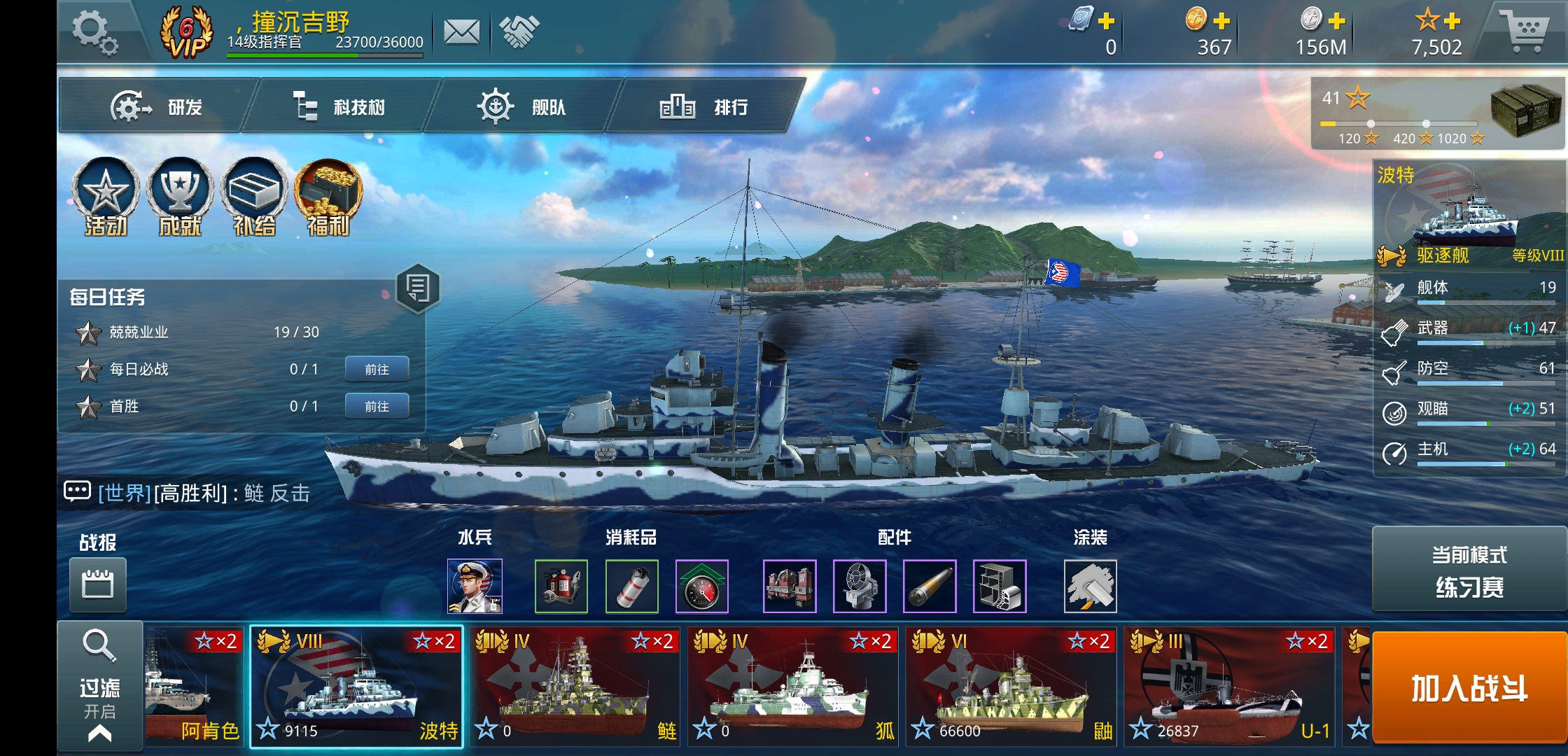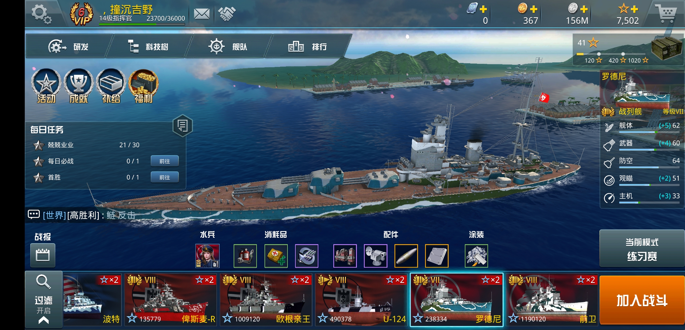 v6账号,由于微信商城不加VIP值,实际上氪了v7是有的。500出号,至少冲着大和和5艘8级金币船(含U124、波特、波斯猫、欧根),一艘7级老罗配全套水兵,这价格还算公允?