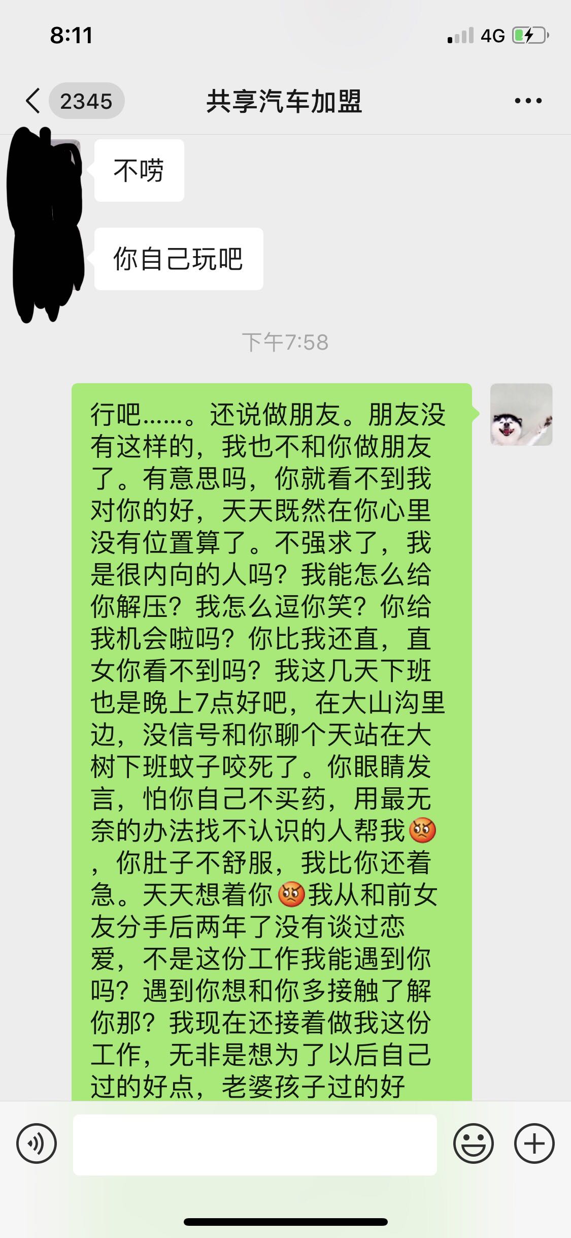 哈哈,楼主的情况和我类似啊,不过我这个是同城的,卖面包的,相亲一年出来耍的次数一个手都数的过来,回消息基本都是几个小时或者一天不回,累啊
