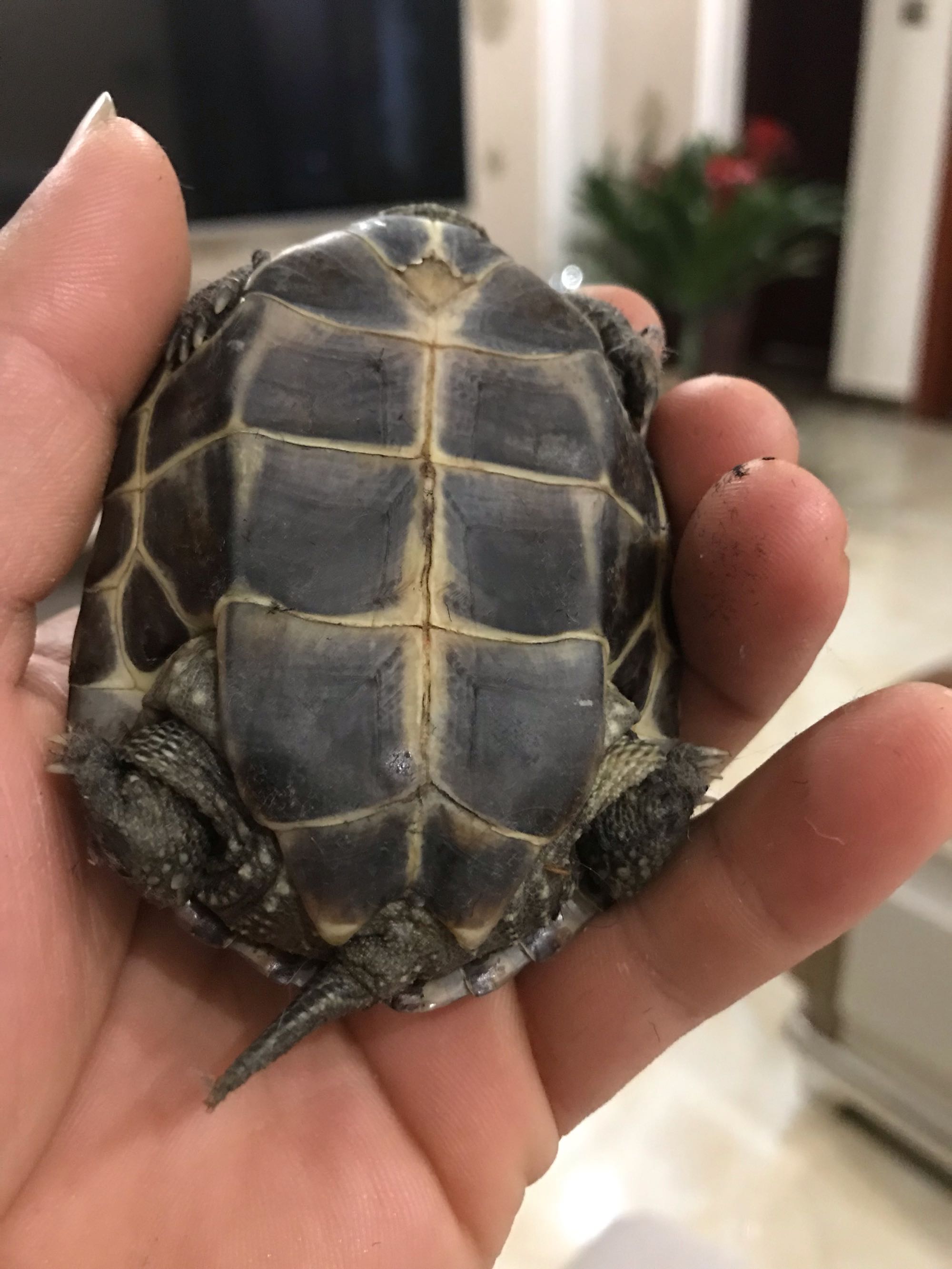 冬天入的龟,新手刚养不太懂。刚出眠没多久,食量可以。想问吧内明白人这是草龟没错吧。是公还是母啊?能墨化吧。背壳纹挺乱的是不是原来得过什么病啊。每晚吃完食就拿出来在屋里溜溜,一天一顿可以吗。谢谢!