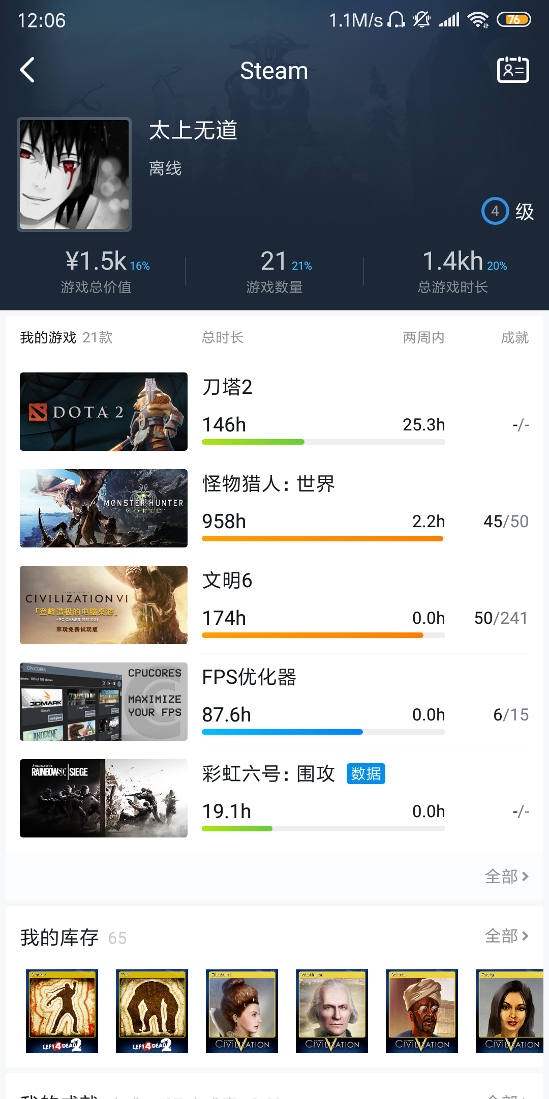 没玩过文明,怪猎加一,双刀玩家,偶尔轻弩。彩6看着挺好,玩了十五个小时就再没动了