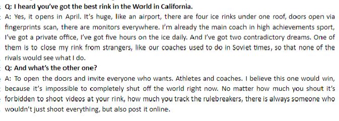 他做了两个梦,一个是像苏联时期的教练一样,冰场不对陌生人开放,以免对手发现他们在干什么。一个梦是冰场对所有人能开放,他相信这个梦会成功,这个时代不可能完全把世界隔开。不管你如何大喊,冰场不能拍视频,你如何盯着违反规定的人,他们还是会不仅啥都拍,还发到网上。