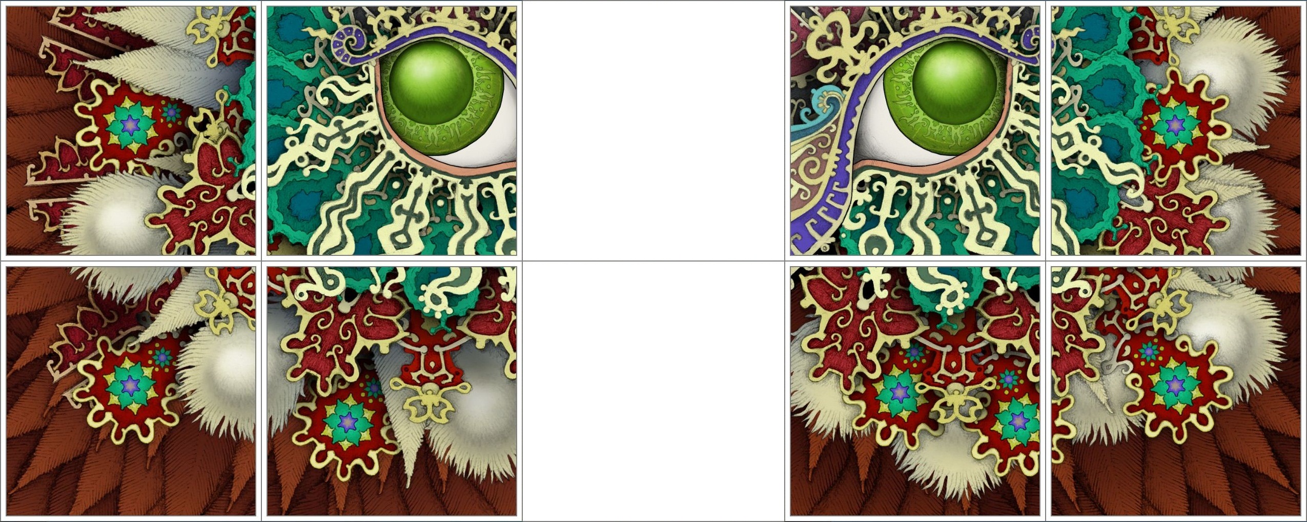 怪兽的眼睛一定是在左上或右上的位置,如果有怪兽图案的石碑在在左边,那么怪兽的眼睛就在右上的位置,反之,如果有怪兽图案的石碑在在右边,那么怪兽的眼睛就在左上的位置,说起来这个设定还是合理的,毕竟怪兽有两只眼睛呀,把两张图合在一起后的效果。