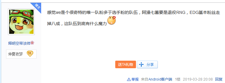 不过皇族个人粉和战队粉区别真的挺大的,经常看到队员粉之间**,也是醉了,谜一样的全华班