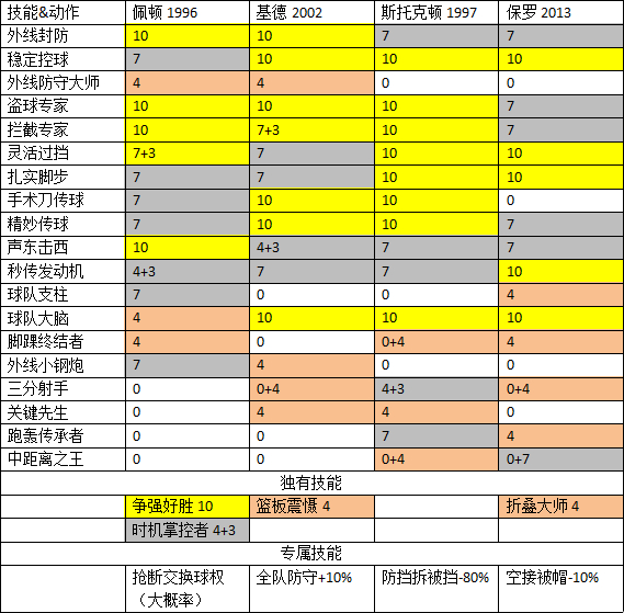 总体来说,基德防投射,佩顿防持球,斯托克顿防挡拆,保罗当混子。基德单防能力最好,进攻能力最差,三分晋升后可以投出A(所有区域),但命中率并不算特别高。基德力量很高,逼停对位者抢断应该还不错,遇到高力量依然被推但比其他几个要好得多。基德没有任何突破动作,持球攻基本靠陀螺,单排体验不好。佩顿刚出晋升那会儿很强,底角三分热区能出A,而且B三分还挺准;后来被削了一刀(基德大概也会削的吧),防守弱于基德,但新增了外线防守大师应该不会差。除此之外,佩顿持球攻应该是最好的。斯托克顿是防挡拆利器,但本身防守并不好,个子矮模型小,容易被撞开也容易被过掉,适合针对挡拆上场。斯托克顿也是四个人里三分投射最好的,抽烟最稳。保罗不说了,从前三个里面选一个你喜欢的培养吧,保罗用来过渡还是可以的,但不晋升不五星强度很低,不推荐。这里把保罗贴上来是为了更直观地看到与前三球星的差距。