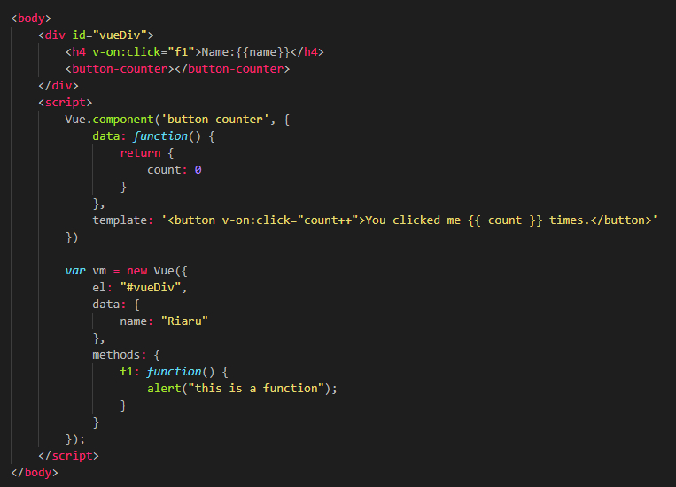 或者,你把组件模版Vue.component('button-counter', {data: function() {return {count: 0}},template: '<button v-on:click="count++">You clicked me {{ count }} times.</button>'})