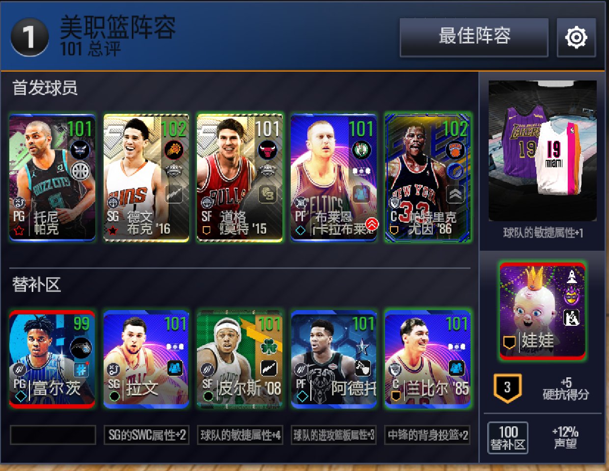 你这替补pg换个100以上带加成的差不多了,全明星杜兰特太贵不建议买,最好攒钱买102威少和魔术师压哨
