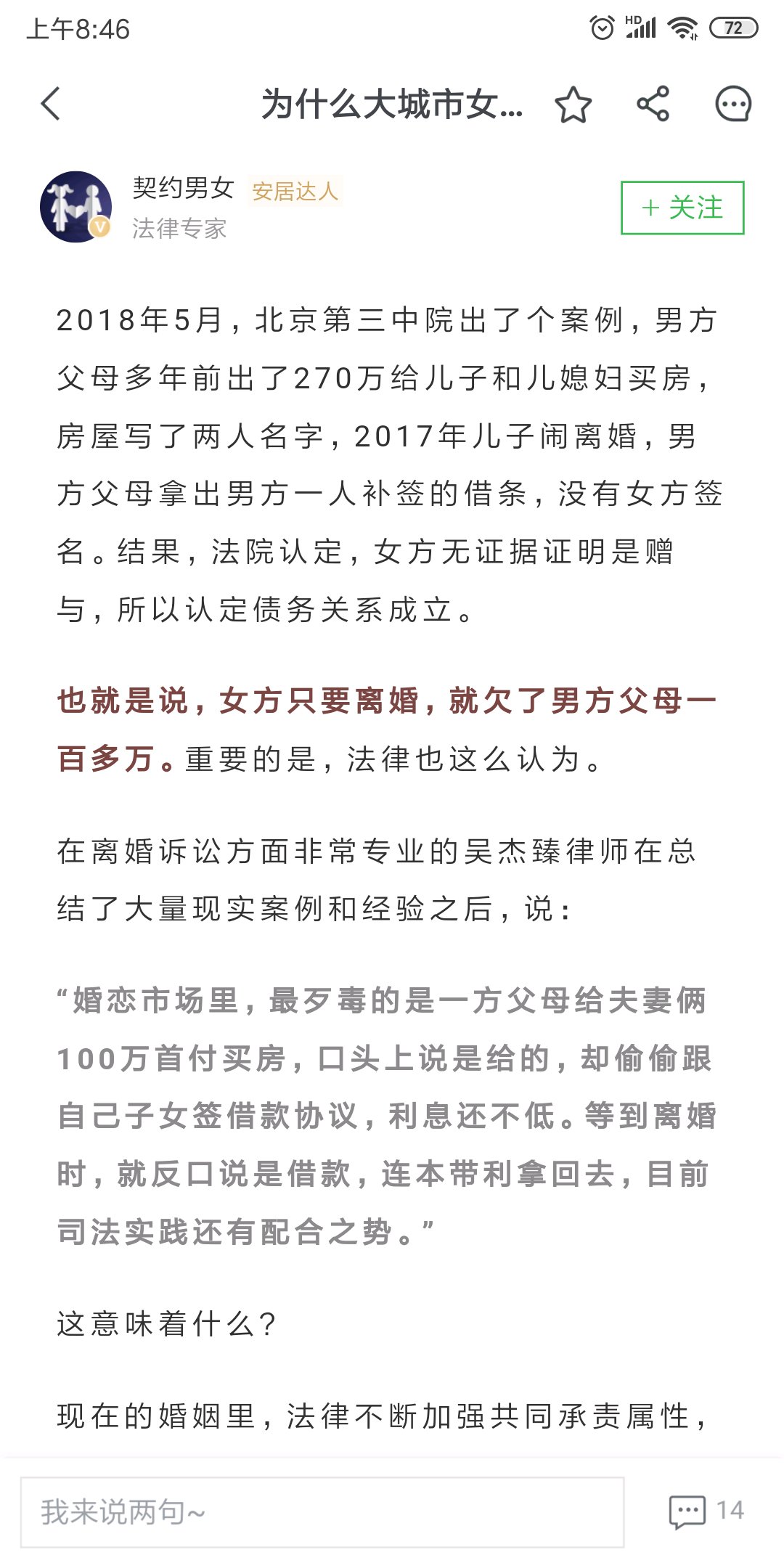 女方虽然欠男方父母一百多万,但占有房子的一半。拿钱的时候就需要明确(最好有书面证据)是借还是赠予,是赠予夫妻双方的还是一方的(父母有权利只赠予自己的子女)。