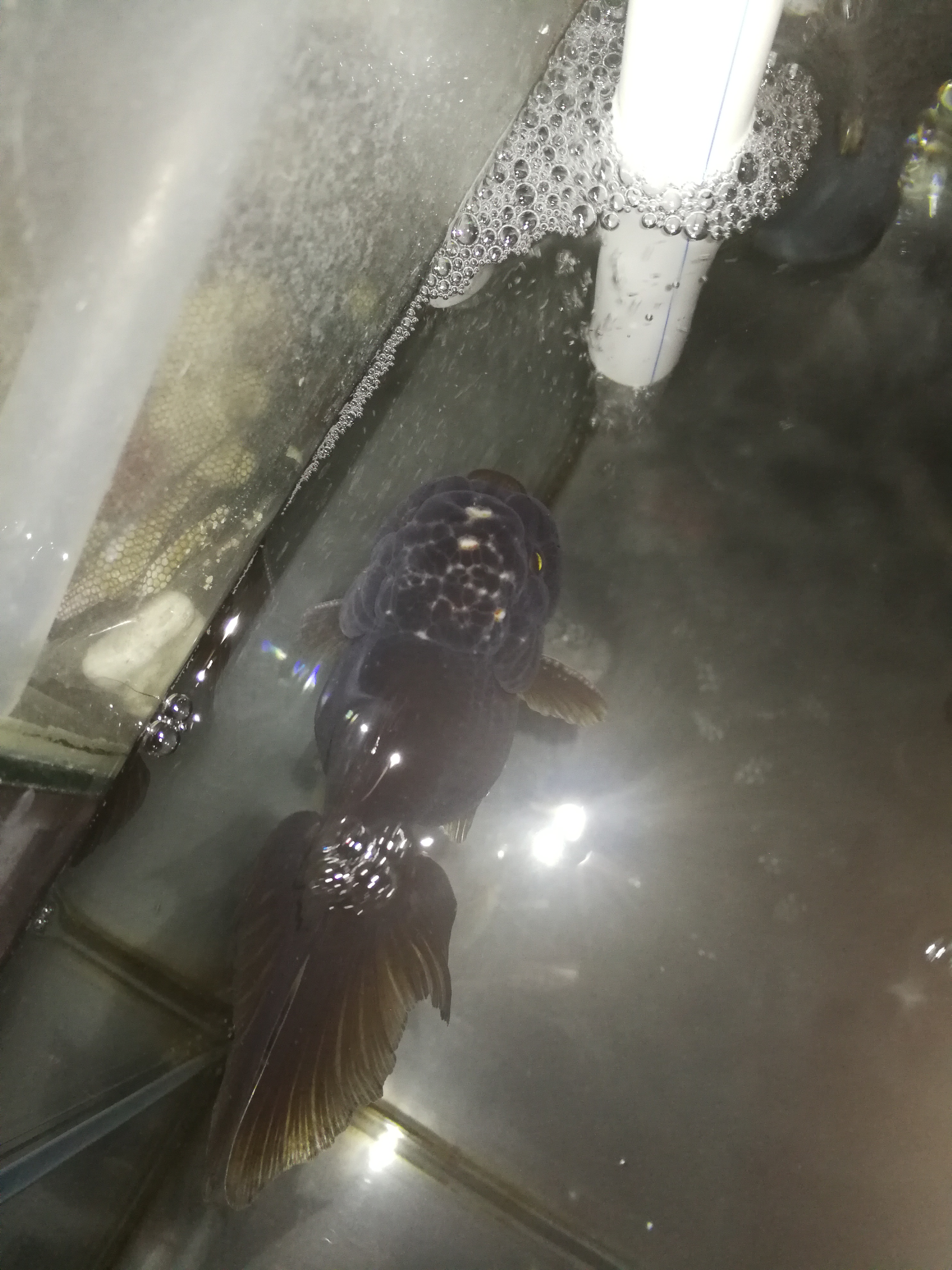 但是有一条突然状态不好了,倒立或者浮在水面,您给看看什么毛病,刚才碰了下肚子有点白色的东西出来