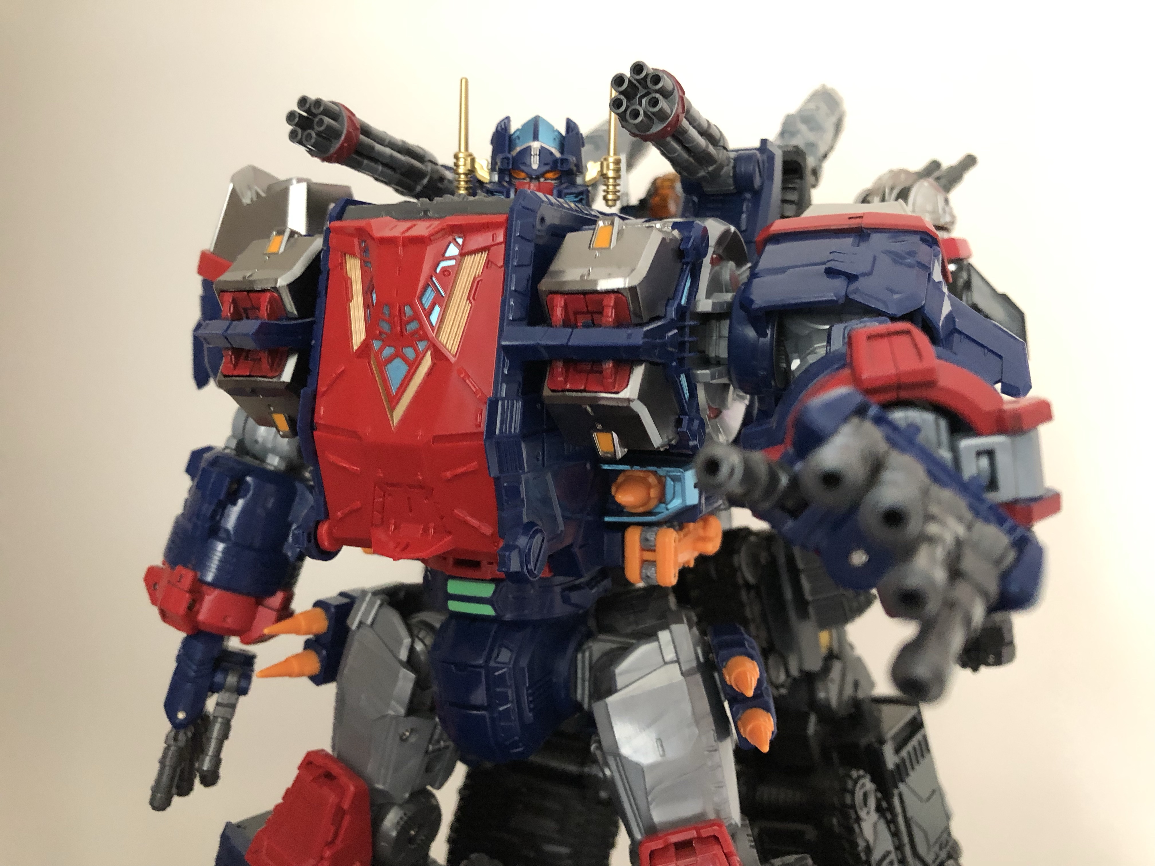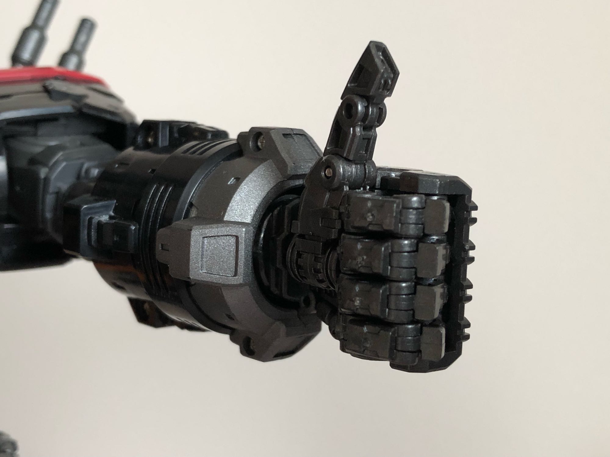手部不算是新规,只有14致敬老玩具是圆形的炮管手指,每根手指虽然单独可活动,但是仅在指根处有关节,无法握拳。而da17将手改为全可动手,每根手指每处指关节均可独立活动,这也是14和17除配色外唯一的差别,而这次33也沿用了17的全可动手设计,因此如果不是特别中意17的配色,花两千多高追也是完全没有必要了。