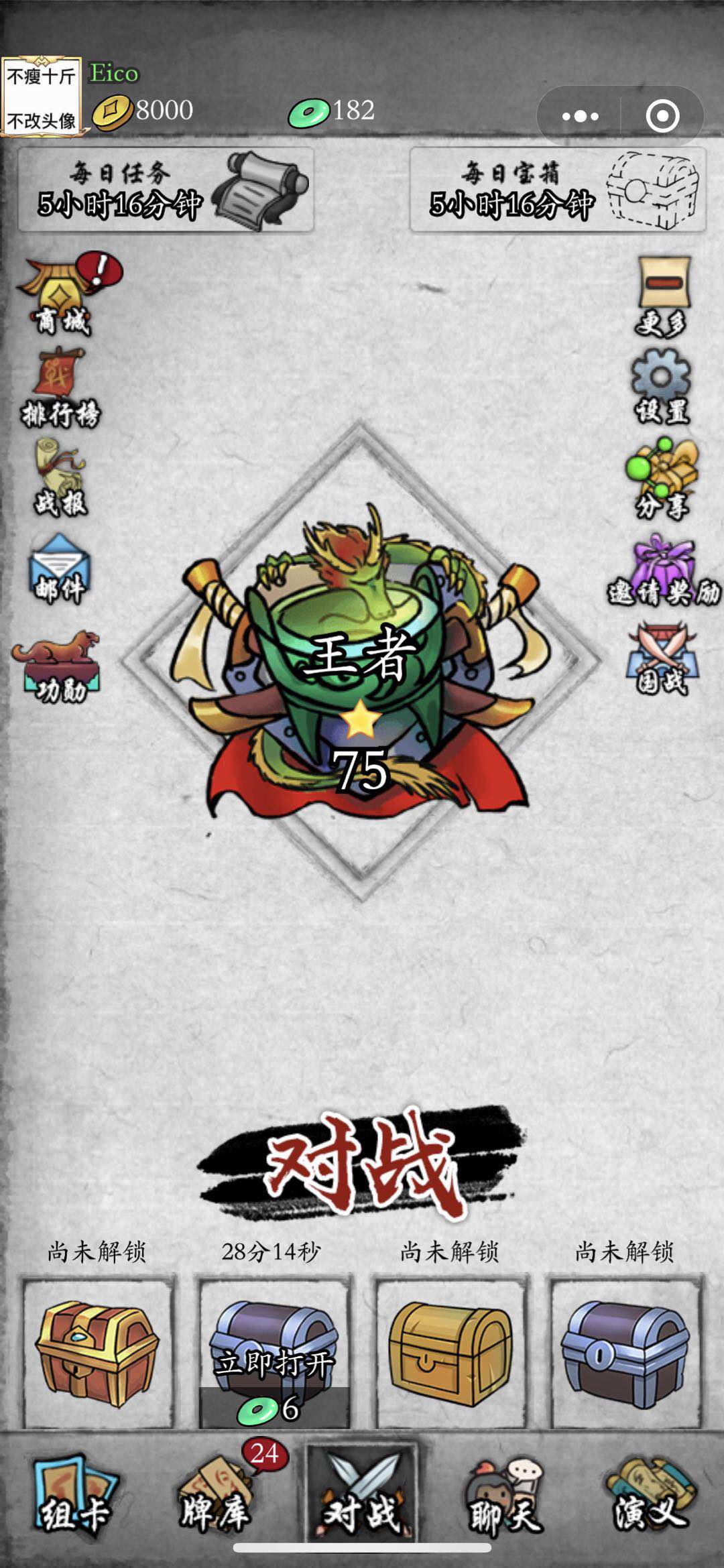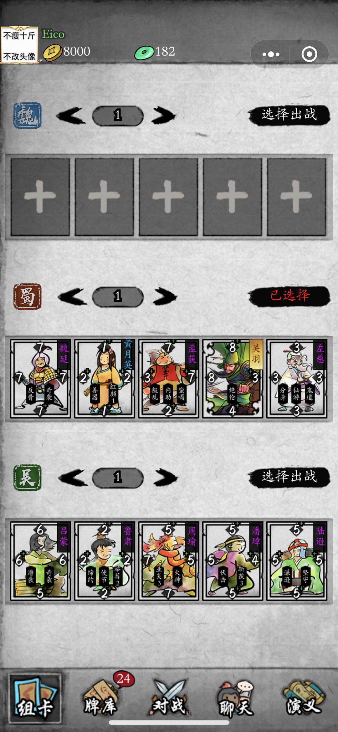 魏国卡组前期比较好打(包括我现在中端局用的也是魏国的一套大哥流)但不是说蜀国卡组就没法打,就是前期遭罪一点,还有就是不是很建议升关羽