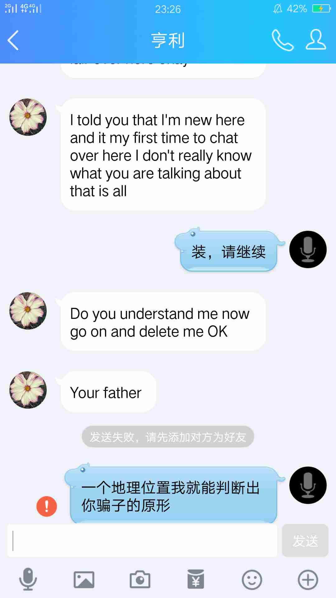 在探探里遇到的骗子,中国人冒充老外,叫莫里斯的在叙利亚军队。没24小时就让我给识破了,我要他的地理位置在QQ里,他说他用军用计算机登录不能发位置的。我就哈哈了,被我诅咒的臭骂了一顿,结果把我拉黑了。