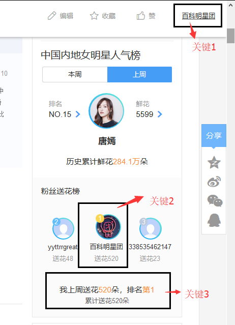 2、上周粉丝榜前三名(在粉丝送花榜页面显示ID)的截图只需要有关键2和关键3处信息即可,位列上周粉丝榜第4-20名粉丝的登记截图需有关键1和关键3处信息才算登记成功。