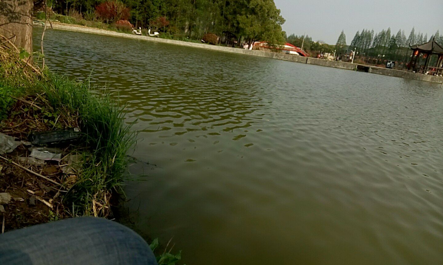 傍晚五点多一口,以为是大鲫鱼,一看劲道不对,立刻竿子斜插如水,把第一把冲劲对付过去。