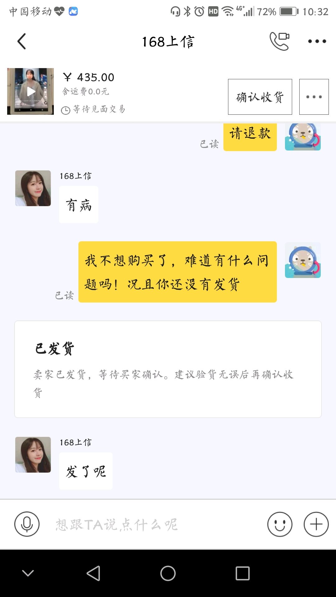 我几乎来了一波骚操作,因为退款10天才能客服介入,一直不收货,地址直接给镇中心广场对面,不理我只能发这里,圆通运费18(不管翻不翻车翻车18块就没了)咬牙给了,好不容易第6天用别人号码假装购买联系上骗子,聊了几句敷衍我就挂了。感觉事情可能坏了,下午及时在咸鱼点举报卖家卖假货,于是每天早上晚上会上线几分钟的卖家,连续4天都没来。