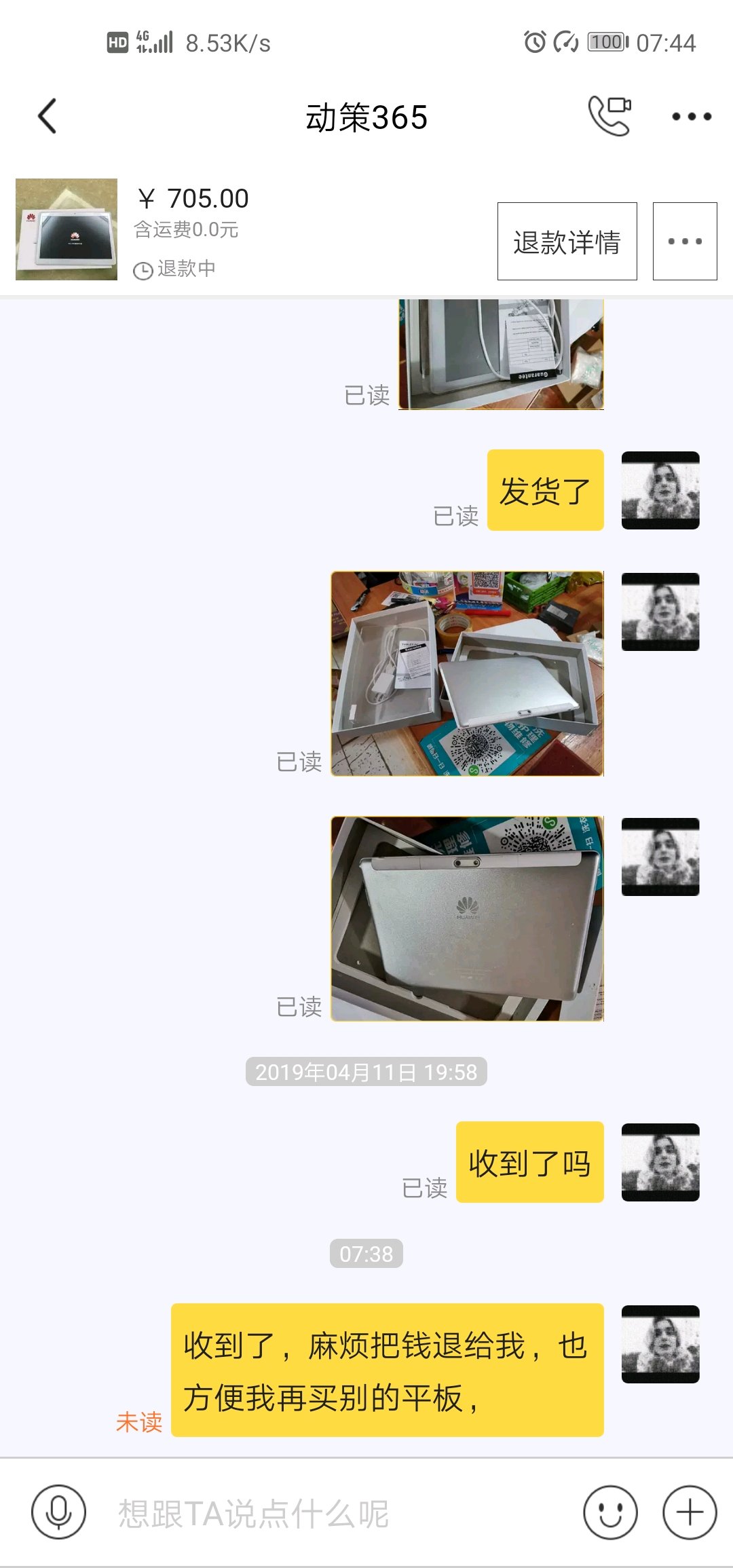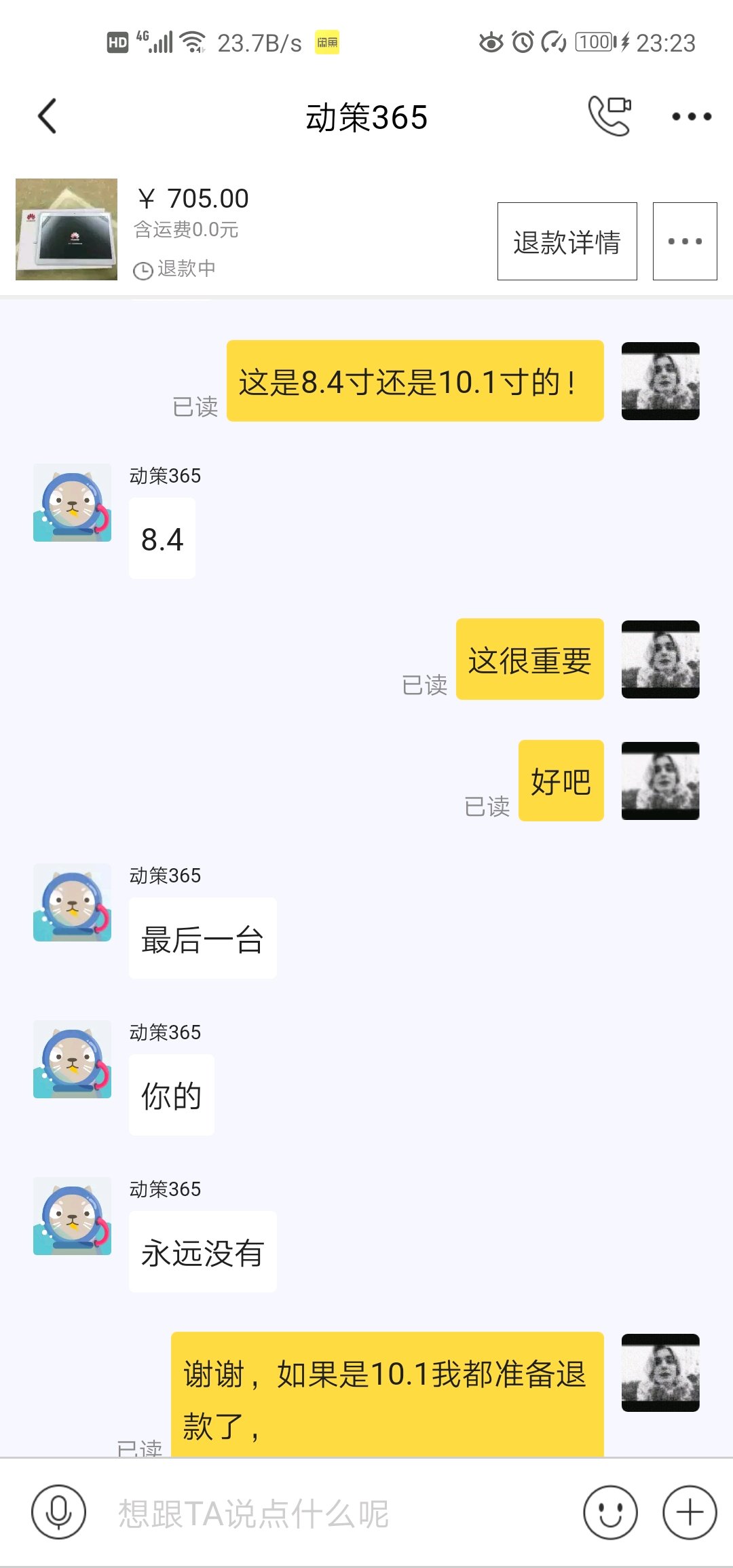 然后,很慌昨天17:30开始等,因为大概18.40,10天就到了,根据咸鱼售后翻车,对方很可能会在最后几秒已没收到货,再拖10天然后客服介入,小法庭。18.35再刚回小区,在楼下等生怕这7分钟出问题。然后度秒如年。神奇的事情发生了,705块居然退给我了!!!
