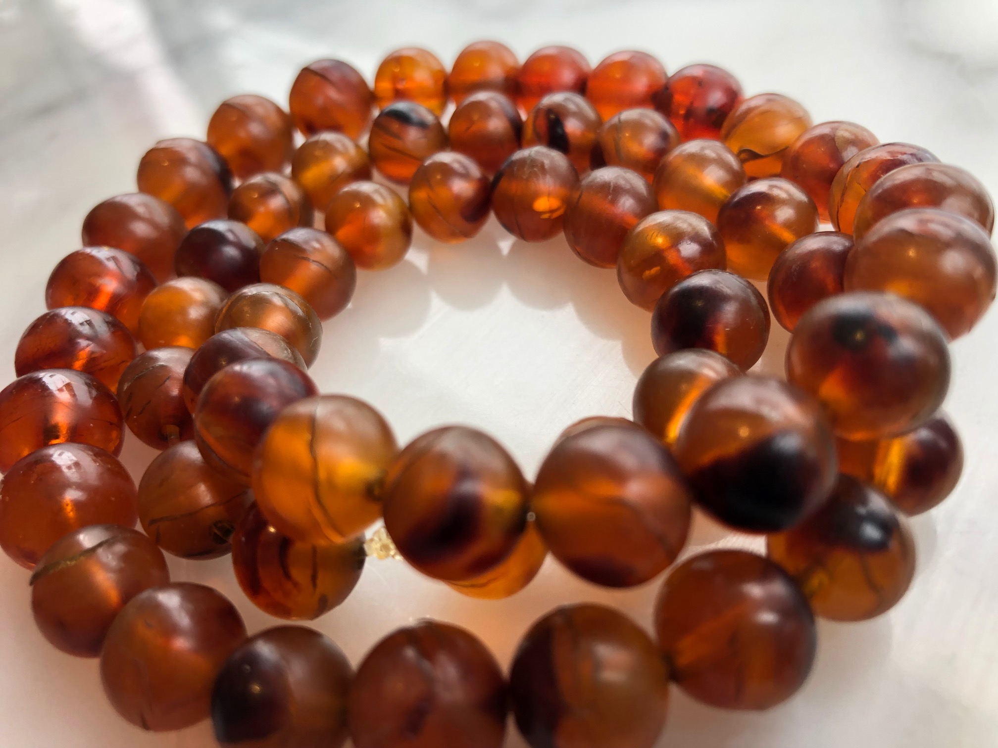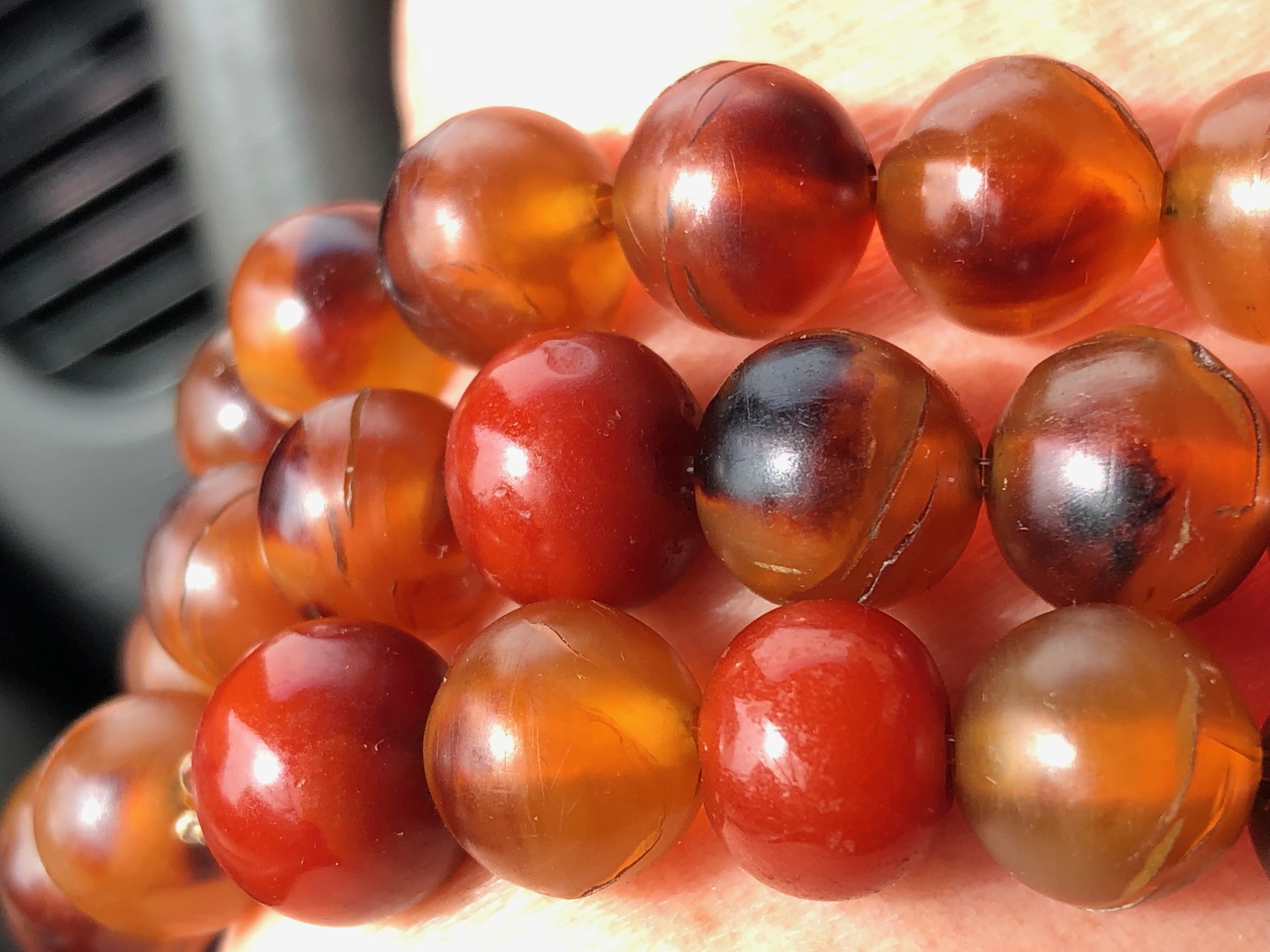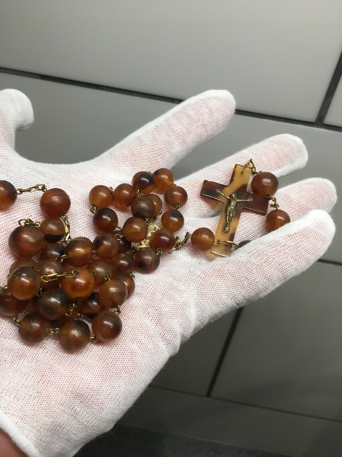 维多利亚时代的念珠串 被我拆了 做手串欠8粒才成3个圈 所以加了些琥珀珠子 12.5mm-10mm 纲上资讯说10mm厚度的珠子多是千年老龟才有的厚度 也不知真假 谢谢欣赏 随评无忌。