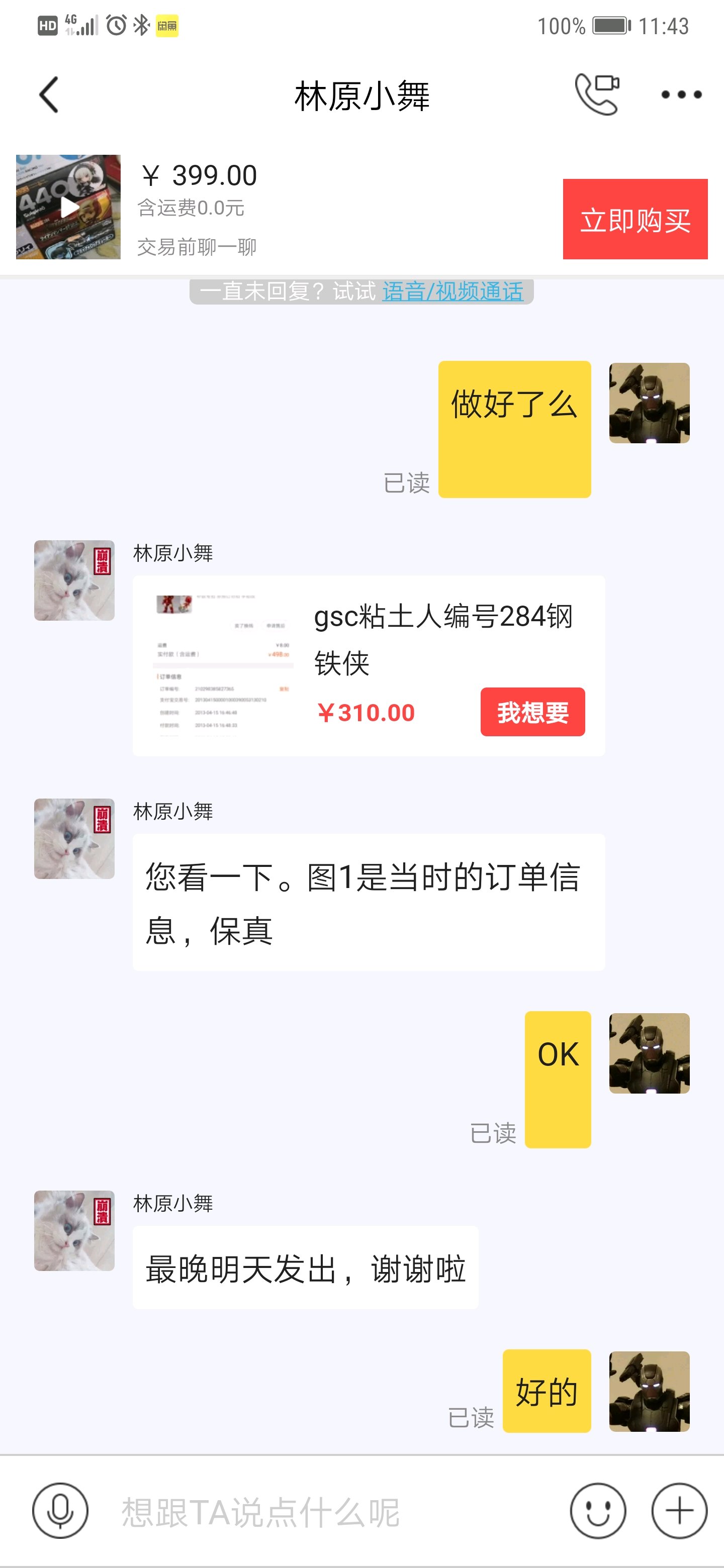 买的是初音300粘土人,付完款告诉我等两天发货,他要出去办事,结果第二天就跟我说他不在家的时候,家中出现了变故,所以不出了。明明之前还拍了葱包的照片的,我也不敢问他家出了什么变故。