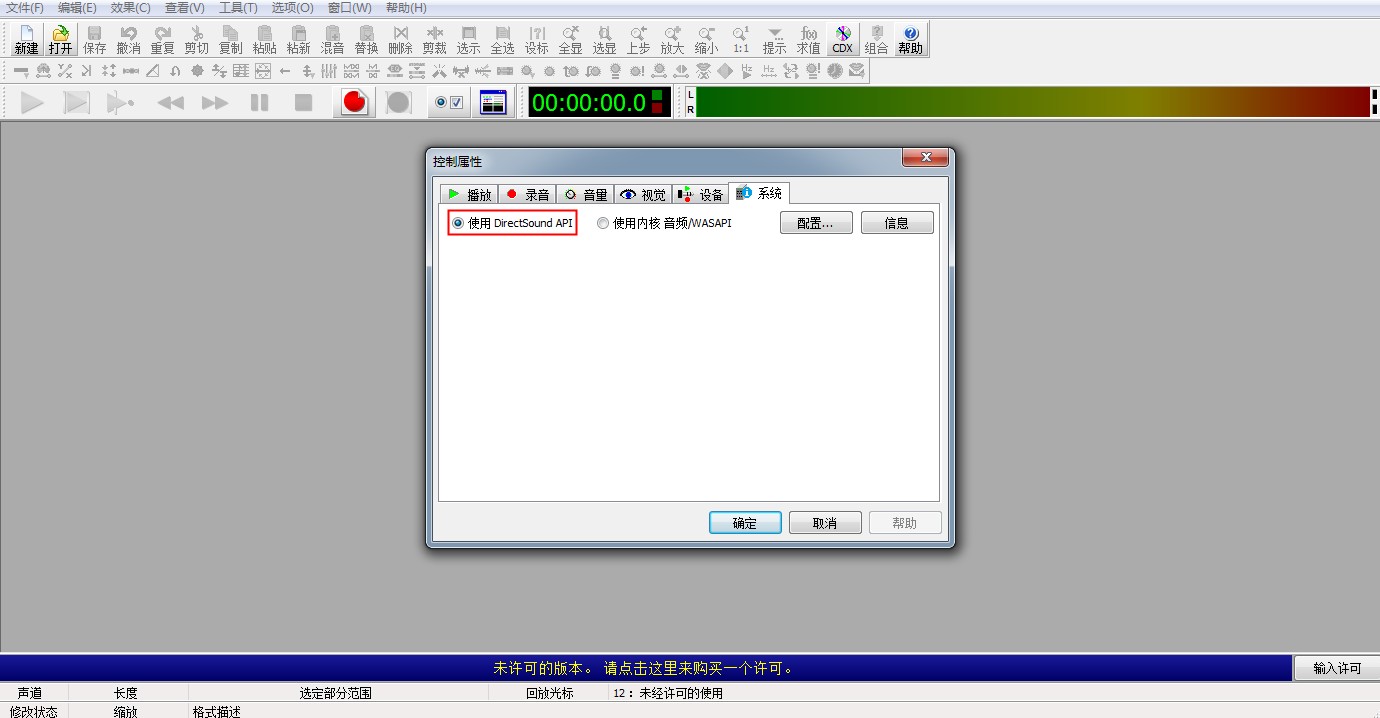 在弹出的控制属性中选择系统,在系统设置窗口勾选使用 DirectSound API,然后点击确定按钮。