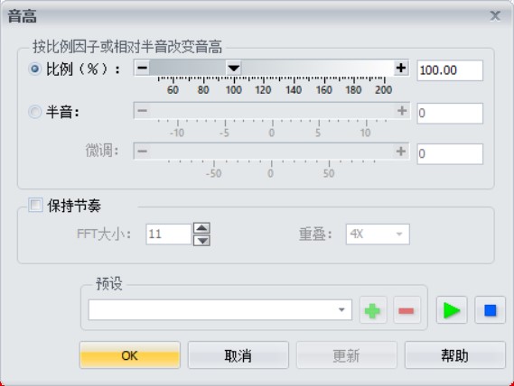 打开GoldWave中文版,在菜单栏中选择“效果—音高”,在音高窗口中,选择半音。如果想要变成小孩子一样清脆的声音,男生可以增加8个音节,女声则增