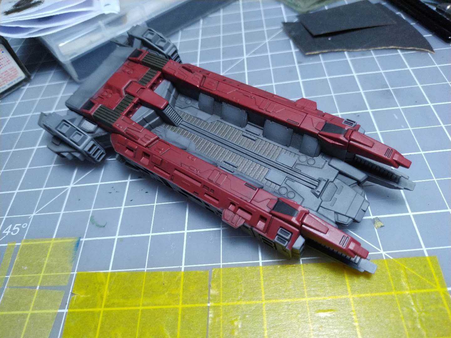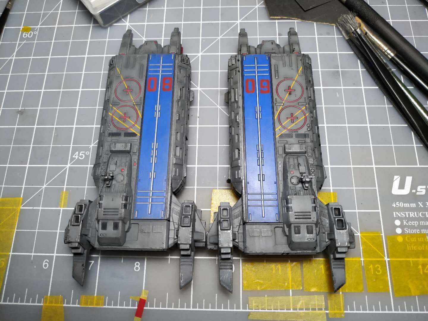 之后把喷口都上色,做旧,把腿的内构涂了,上夜光贴纸。还有红线加粗,和喷消光漆