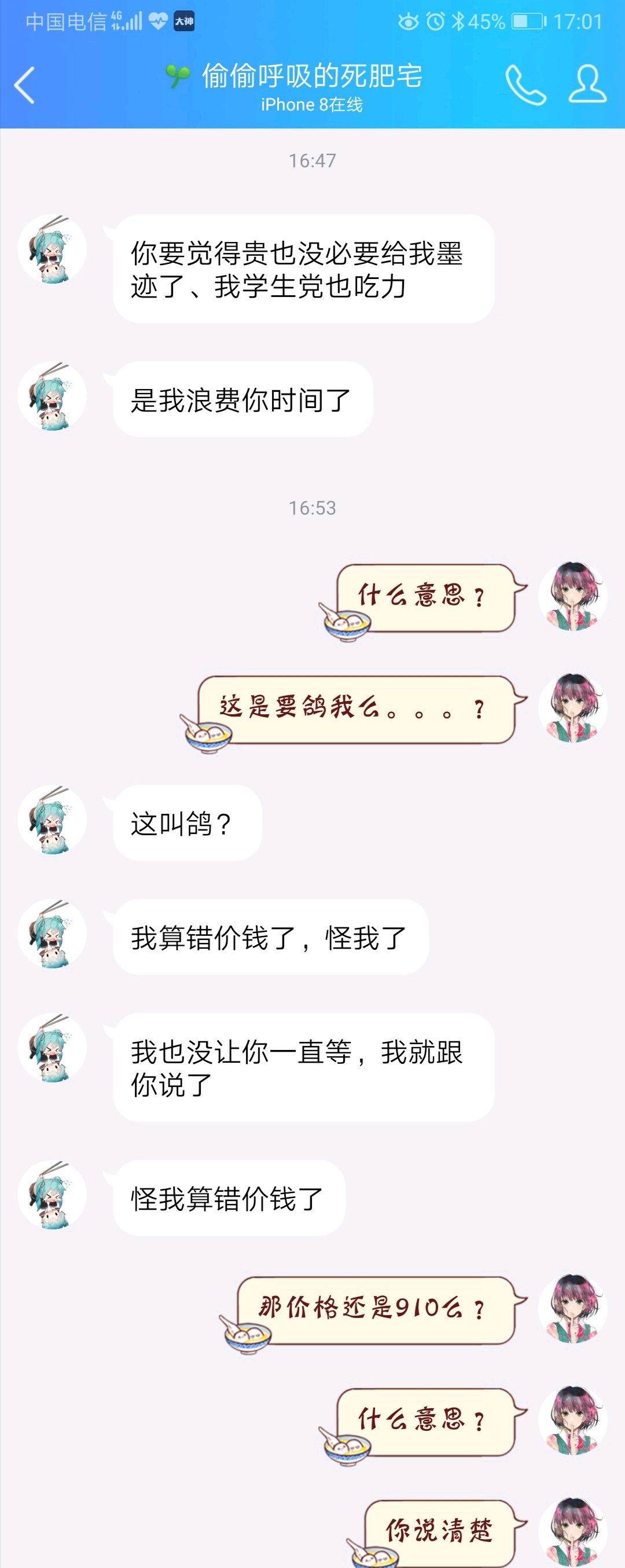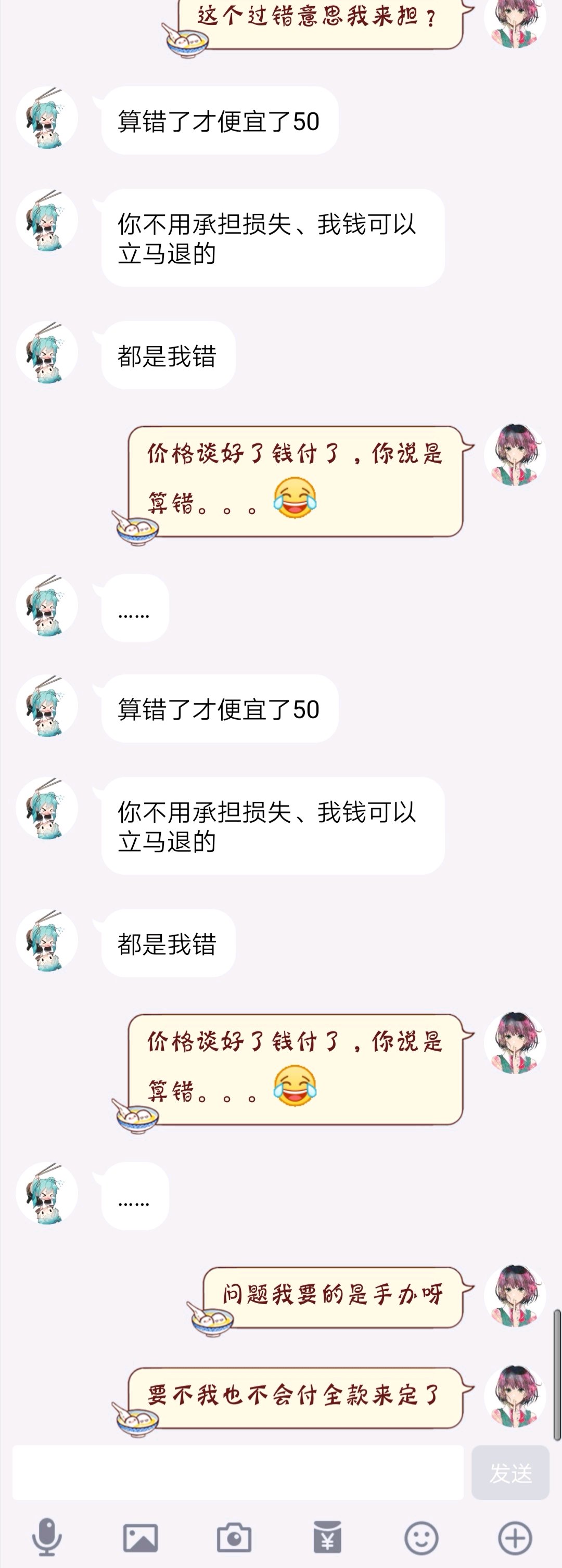 【挂】第一次挂人,被气的不行。。。现在的学生党真是一句算错了,就可以随便鸽?谈好的价我都愿意全款付款防鸽了,还能这样?价都谈好了钱也付了,隔了半个小时说自己算错价?我怎么知道你是自刀50还是算错价?自己的问题要我来承担?真当社会是你家?一句错了就什么都可以解决?懂不懂什么叫契约精神?