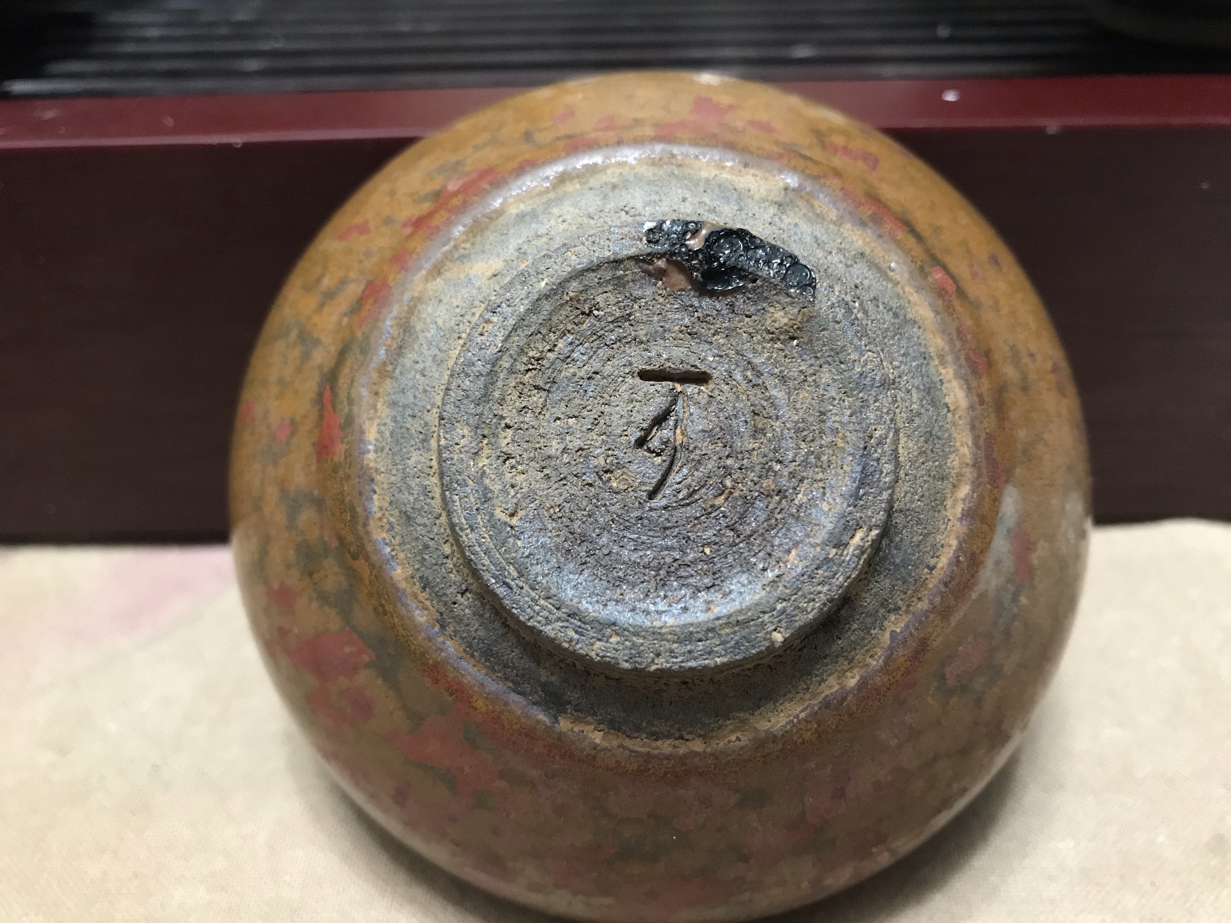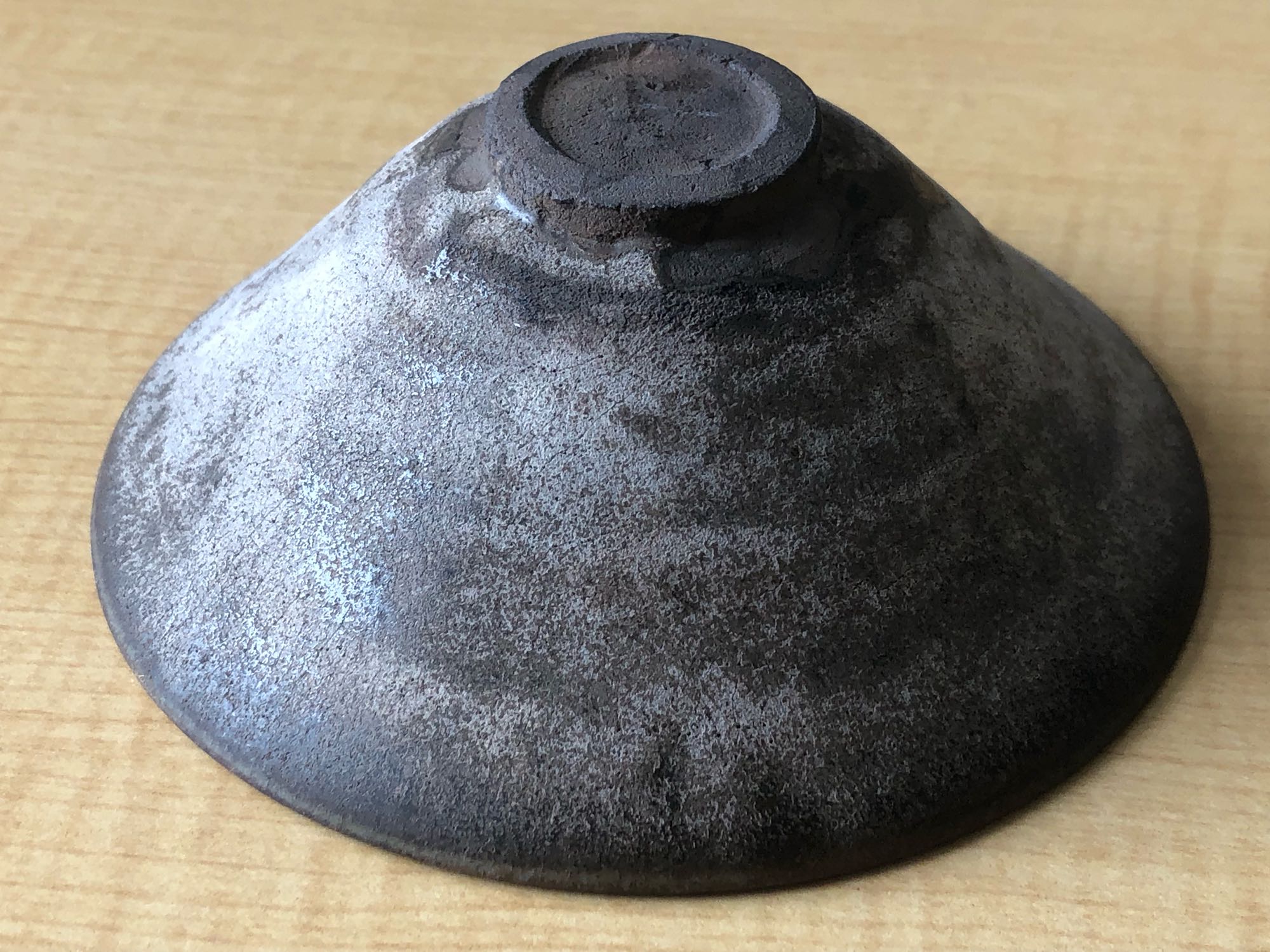 北宋斗笠型,胎壁较薄,釉也比较薄,不会形成垂滴。有别于南宋的束口型和撇口型盏那种胎比较厚,釉有垂滴的感觉。釉之所以是这样,是由于生烧导致,就是烧造温度没到位,到位了就是乌金、兔毫甚至柿红。所以这类盏属于是有窑病的,但日本人很喜欢这类感觉,可以符合他们茶道中营造的“枯侘寂”氛围