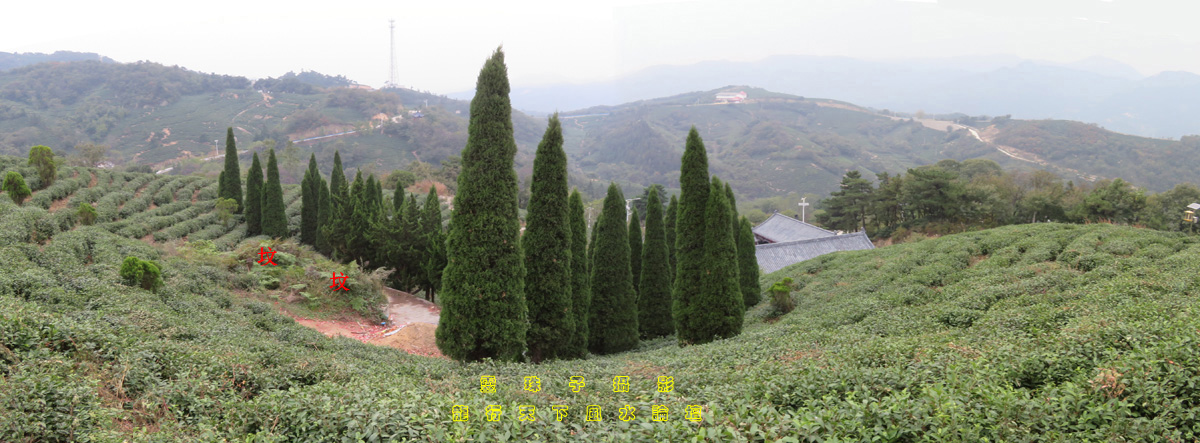 图19,因坟前种了不少柏树遮挡视线,只能于拜台下拍摄明堂,先以白虎砂收拾内局,再以平腰马作案,远以土形高山为朝。