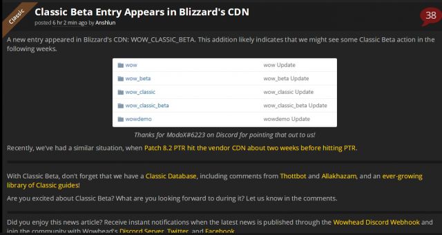 同时WOWhead官网发布新闻,暴雪的CDN目录中出现了WOW_CLASSIC_BETA。也许,经典旧世beta未来几周真的可以面世了。大家拭目以待。