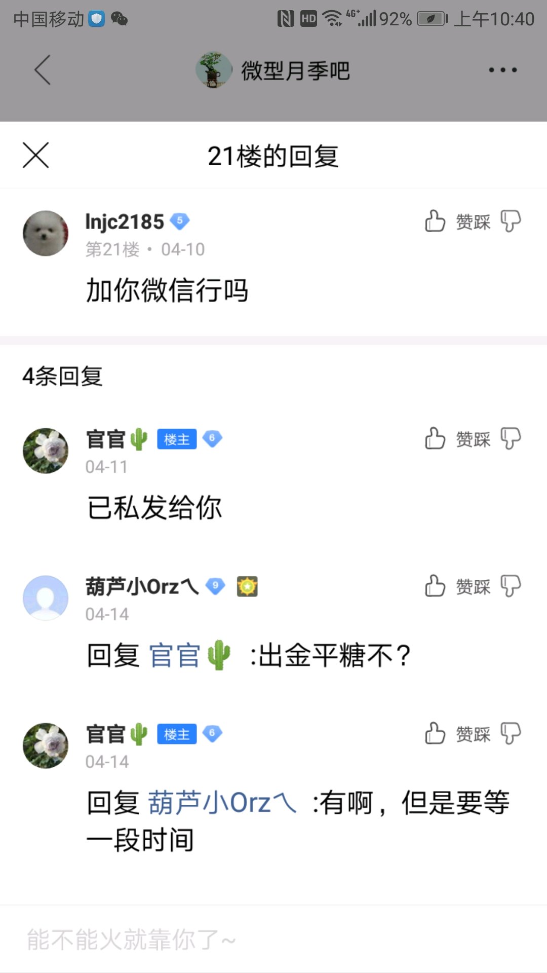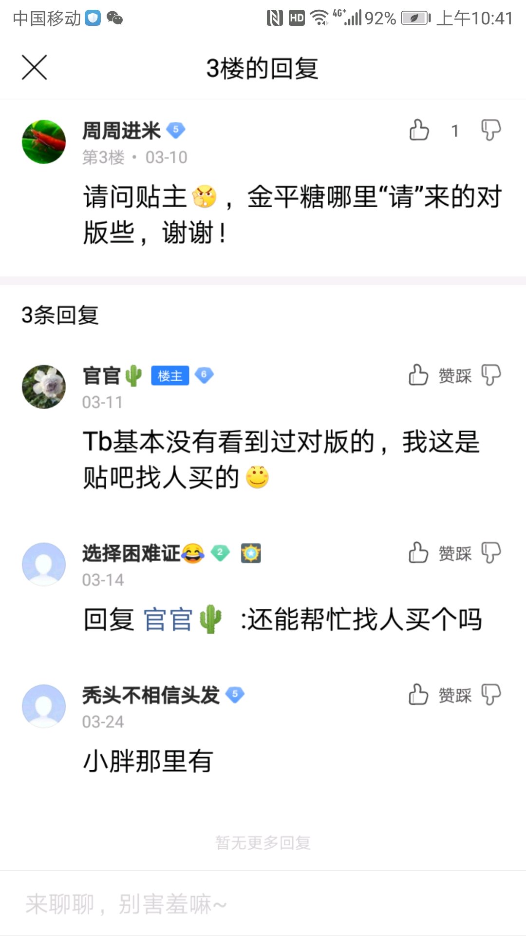 **又在这里bb你去看下贴子,你这是糖别往自己脸上贴金了。你帖子看下。后面都写着,帖子一发买金平糖的私信很多,别人都眼睛亮着。别自欺欺人了