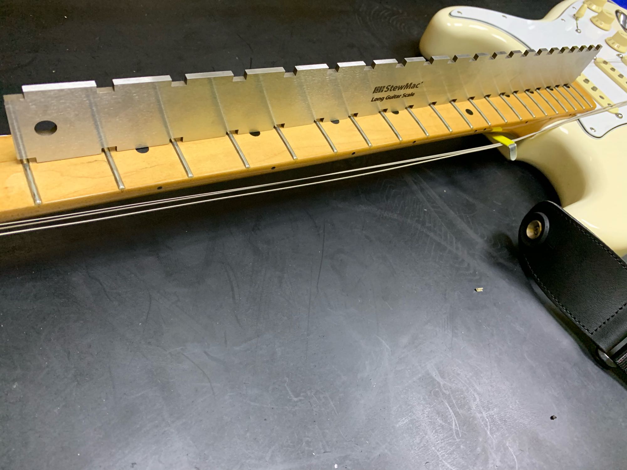技术贴,教你怎么让弦距调到最低不打品,首先,如图一所示,需要将所有琴弦拆卸,或放松,琴颈调直需要在没有琴弦拉力的情况下完成,接下来我们放上指板找平尺,从图二看到,2.3品有略小的缝隙,说明琴颈中间部分有点凸起,才会造成2.3品凹陷,那接下来我们用内六角调节钢筋,并观察指板状态,发现指板找平尺完全和指板贴合后,此步完成,此时琴颈是完全笔直的状态,也是弦距调到最低的基础中的基础,好了,接下来就是图5,用品丝找平尺放在所有品丝上面,我们发现这把琴品丝是完全平的,并没有缺口,所以不需要品丝找平,此时,上琴弦,你会发现弦距可以调整到异常低,这把琴最后的数据是6弦1.25毫米,但是我忘记拍照了,好了,调弦距就讲到这里