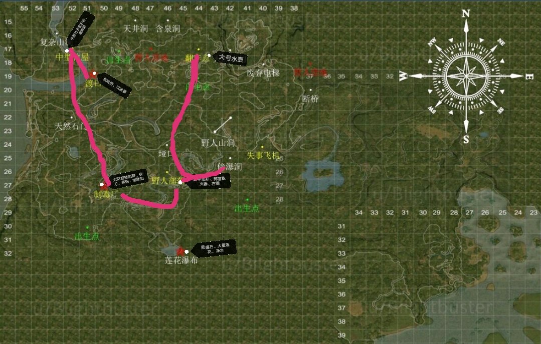 1.先刷一个好点的出生地,沿着河道走不会迷路
