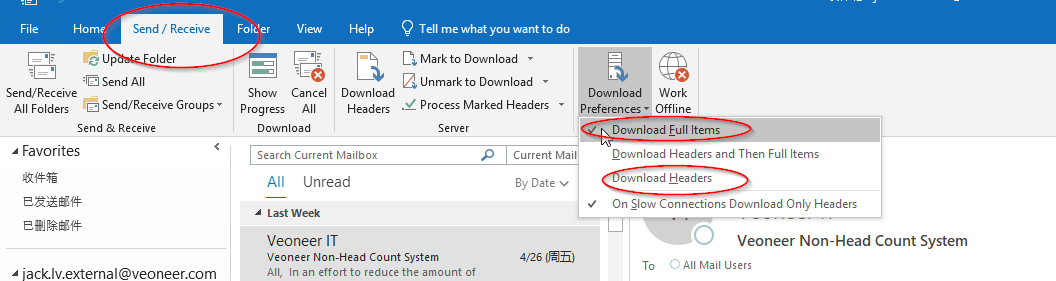 如图,在这里设置一下,默认的是下载整个邮件的,取消掉然后设置成下载标题就可以了,这样他只会下载你选择打开的邮件的所有内容,当然这样做会导致你每次打开邮件会比较慢。